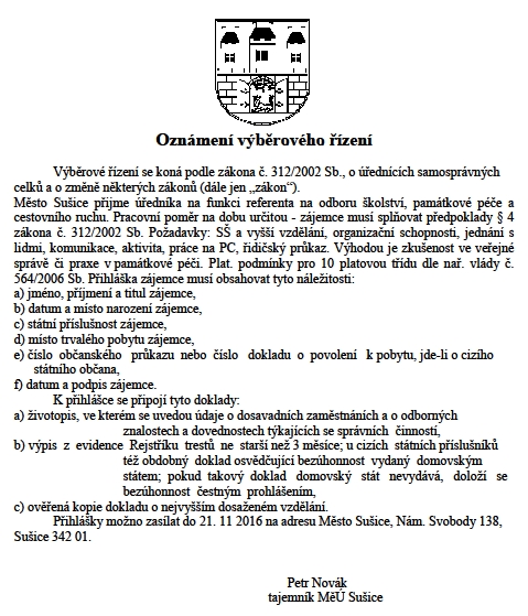 Místo výkonu práce: Městský úřad Kašperské Hory – odbor vnitřních věcí