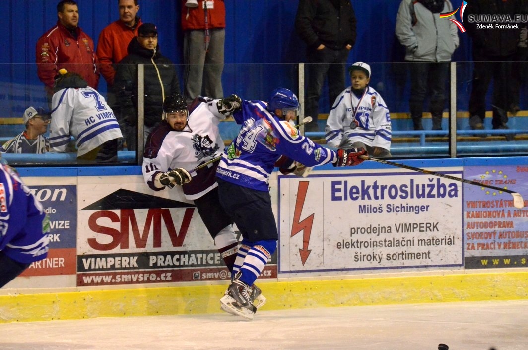 Obránci HC Vimperk Jan Předota a Michal Horejš v neděli 13.11.2016 v zápase s Hlubokou ukázali útočníkům soupeře, jak jsou šumavští obránci tvrdí! Hokej je tvrdá hra!