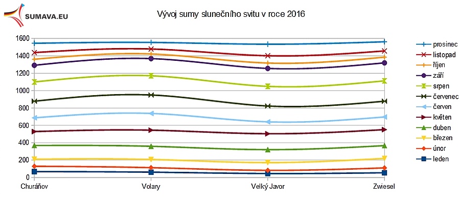 Velmi zajímavé je, že pokud sečteme měsíční hodnoty svitu jednotlivých stanic za rok 2016, roční úhrn svitu se prakticky neliší, rozdíly jsou zanedbatelné. Na přiloženém grafu jsou znázorněny jednotlivé měsíce a úhrny slunečního svitu (v hodinách). Přes léto ztrácí horské polohy, kde se často tvoří kupovitá oblačnost. Naopak horské stanice tuto ztrátu svitu dohání právě při inverzích v zimních měsících.