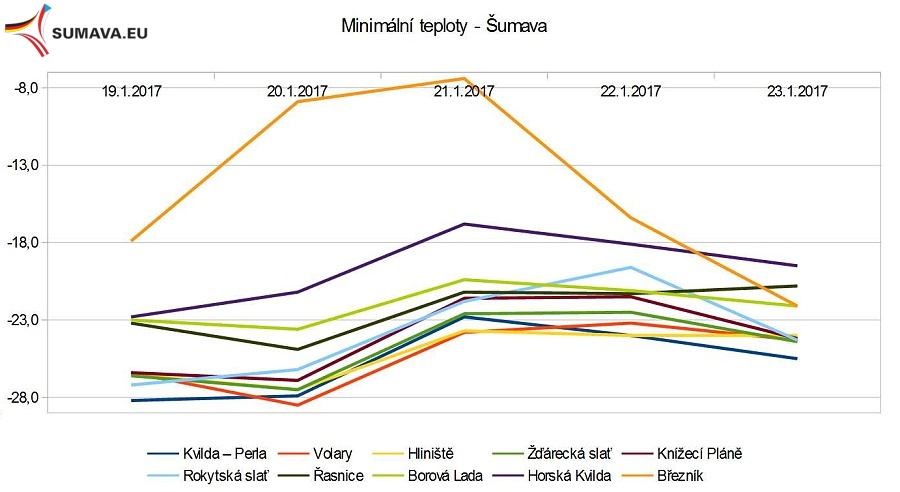 Za posledních pět dní byly průměrně nejnižší teploty naměřeny 19. ledna. V tento den byla nejnižší teplota změřena na stanici Kvilda – Perla -28,2°C. O den později, tedy 20. ledna byla nejnižší teplota ve Volarech, to se opakovalo i další den, tedy 21. ledna. V dalších dnech, 22. a 23. ledna měla nejnižší teplotu opět stanice Kvilda – Perla a to v jednom dni spolu s Hliništěm.