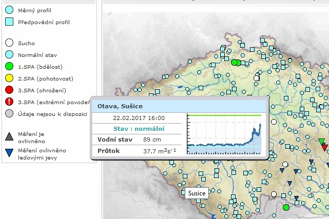 …“do čtvrtečního odpoledne očekáváme srážkové úhrny 40 až 60 mm. Většina srážek bude v dešti.V reakci na další očekávané srážky a přetrvávající teplé a větrné počasí bude zejména během noci a zítřejšího dne docházet k opětovným vzestupům hladin vodních toků. Výrazné vzestupy očekáváme zejména v povodích Smědé, Lužické Nisy, Mandavy, Ploučnice a Kamenice, kde nelze vyloučit dosažení 3. stupně povodňové aktivity. K významnějším vzestupům bude docházet také na tocích, které odvodňují Jizerské hory, Krkonoše a Orlické hory (zejména pak v povodí horní Jizery a horního Labe), kde může být dosažen 2.SPA. Dosažení 1. SPA předpokládáme také na tocích odvodňujících Šumavu a Český les (horní povodí Otavy a dále v povodí Nežárky), Českomoravskou vrchovinu, a také v Olomouckém a Zlínském kraji. Ojediněle nelze vyloučit dosažení 1. SPA i v jiných oblastech. Na několika tocích, zejména na Moravě, jsou hladiny i nadále ovlivňovány ledovými jevy v korytech, v jejichž v důsledku na některých tocích může být dosažen 1. a 2. stupeň povodňové aktivity. Situace bude i nadále upřesňována.“