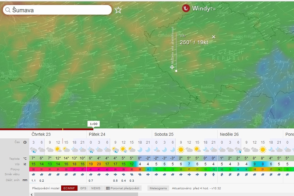 „V noci na pátek a v pátek dopoledne bude vítr postupně silný až velmi silný o rychlosti 70 až 90 kilometrů v hodině, na frontě přechodně až 110 kilometrů v hodině, na horách s nárazy kolem 130 kilometrů v hodině,” varovali meteorologové.