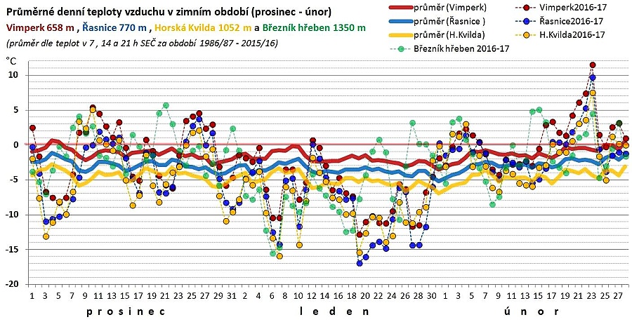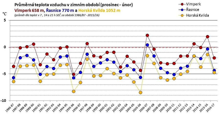 Pro hodnocení zimy 2016/17 (klimatologická zima, tedy období prosinec až únor) na Šumavě bylo v tomto případě využito průměrných denních teplot a jejich dlouhodobého průměru počítaného ze zim 1986/87 až 2015/16. Ve všech