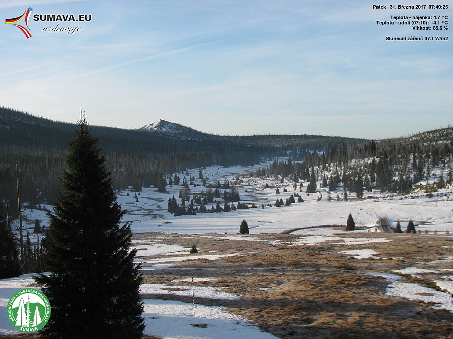 Teplé jarní počasí beze srážek pokračuje, sněhová pokrývka za poslední týden tedy značně ubyla. Souvislá sněhová pokrývka se drží už jen v nejvyšších polohách a to spíše na slunečně méně exponovaných místech. Jižní svahy jsou i v nejvyšších polohách místy holé.