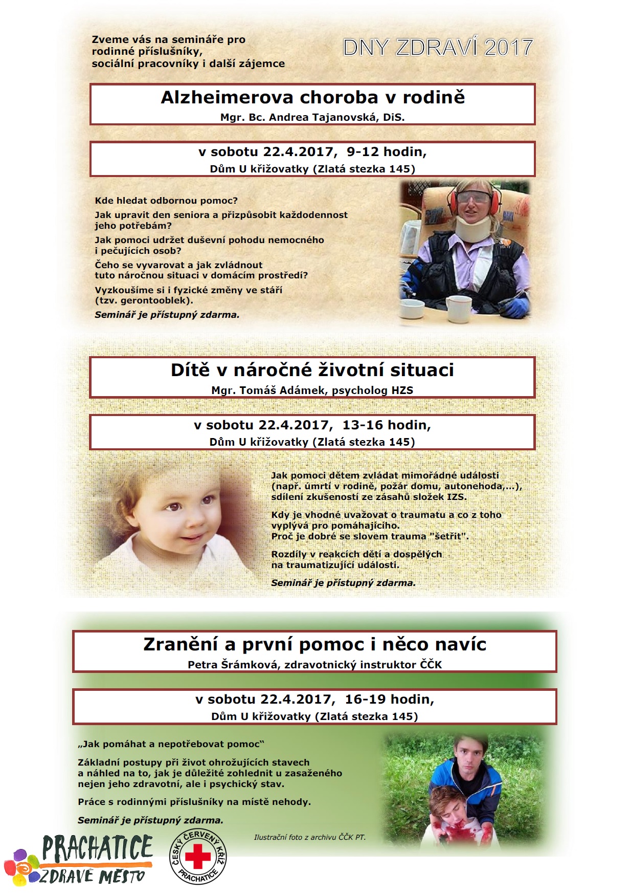 Dopoledne od 9 do 12 hodin proběhne v Domě U křižovatky v Prachaticích na adrese Zlatá stezka 145 seminář „Alzheimerova choroba v rodině“ s Andreou Tajanovskou. Je určen rodinným příslušníkům, sociálním pracovníkům a všem, kteří si pokládají podobné otázky: Kde hledat potřebnou pomoc? Jak pomoci udržet duševní pohodu nemocného i pečujících osob? Čeho se vyvarovat a jak zvládnout tuto náročnou situaci v domácím prostředí? Zároveň si i vyzkoušíme fyzické změny ve stáří na vlastní kůži, díky tzv. gerontoobleku.