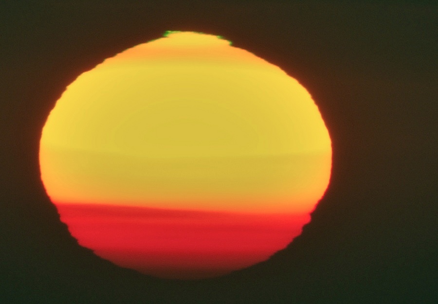 Zdálo by se, že druhé červnové zapadající sluníčko pocítilo potřebu zpestřit svůj odchod přímo ornamentálně, k čemuž využilo ideálně postavených trhlin v oparu nad obzorem.