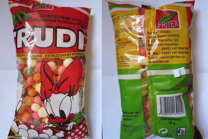 Státní zemědělská a potravinářská inspekce (SZPI) zjistila na trhu pochutinu, u které laboratorní analýza potvrdila přítomnost tří druhů nepovolených syntetických azo-barviv. Jedná se o výrobek Trudi – Kukuřičné křupky sladké, Extrudovaný výrobek, v baleí 70 g, s označením data minimální trvanlivosti do: 23 05 2017, výrobce: Július Šuvert Fritex, 980 33 Hajnáčka 125, Slovensko, dodavatel: Racional CZ s.r.o., Vraclav 5, 56542. Země původu: Slovensko. Předmětná šarže byla do ČR dovezena do firmy Martin Zbroj, Zálší 18, 56501 Zálší.