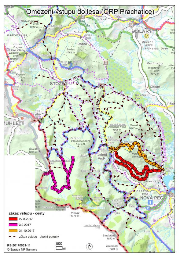 1. Neplatí to pro cestu z hraničního přechodu 1/10 Rakouská cesta (červená TZT směrem na Plechý) až po křížení se žlutou TZT v místě Pod Plechým (mapka). Zde budou odklízecí práce ještě pokračovat.