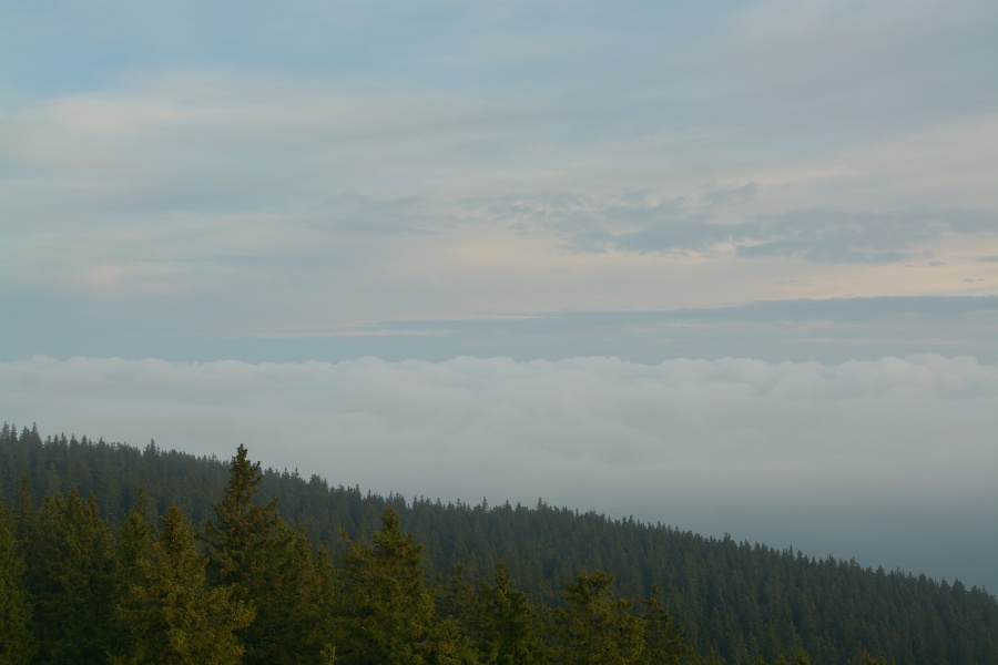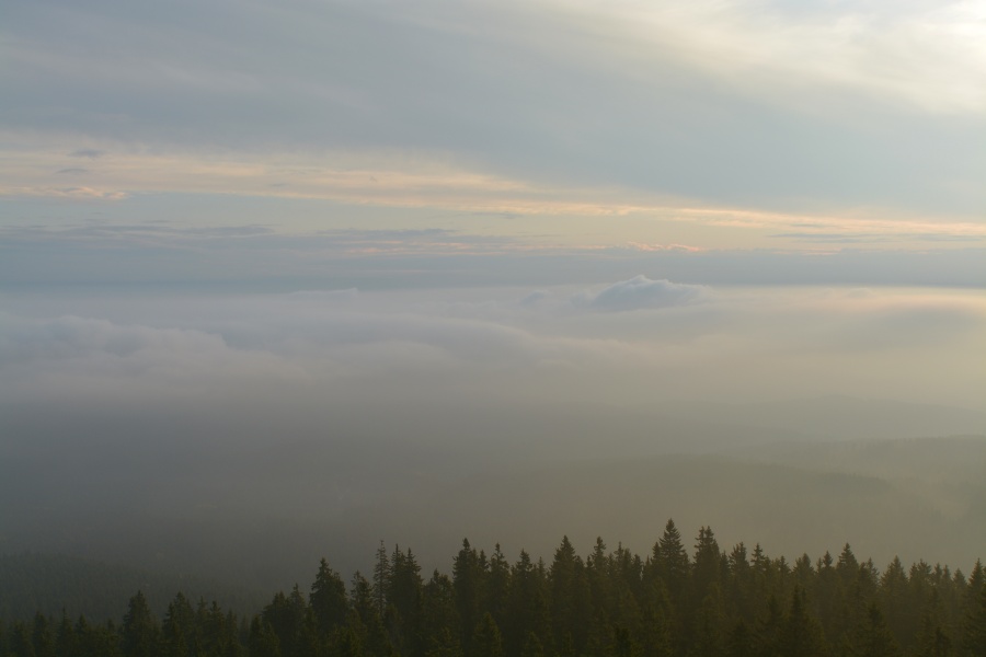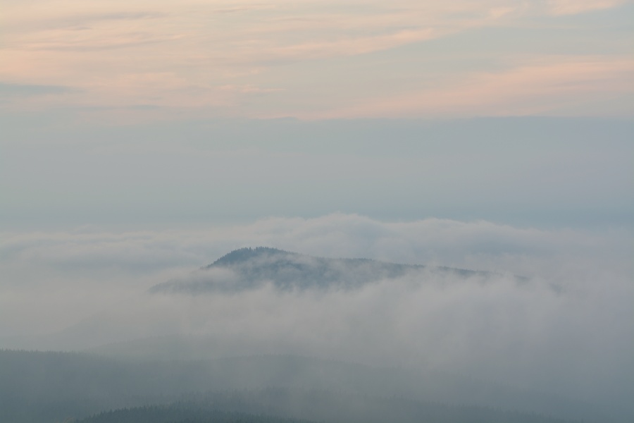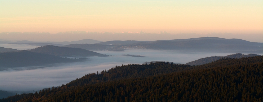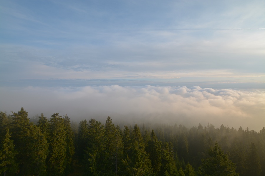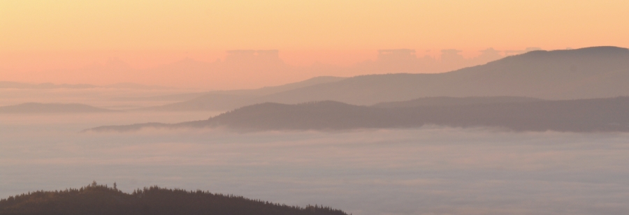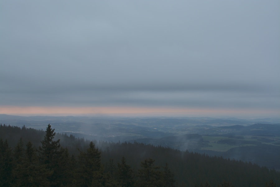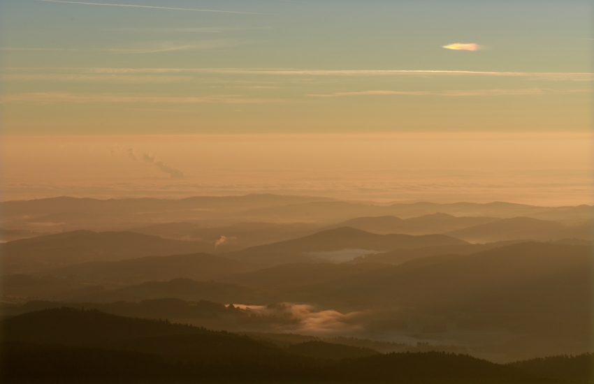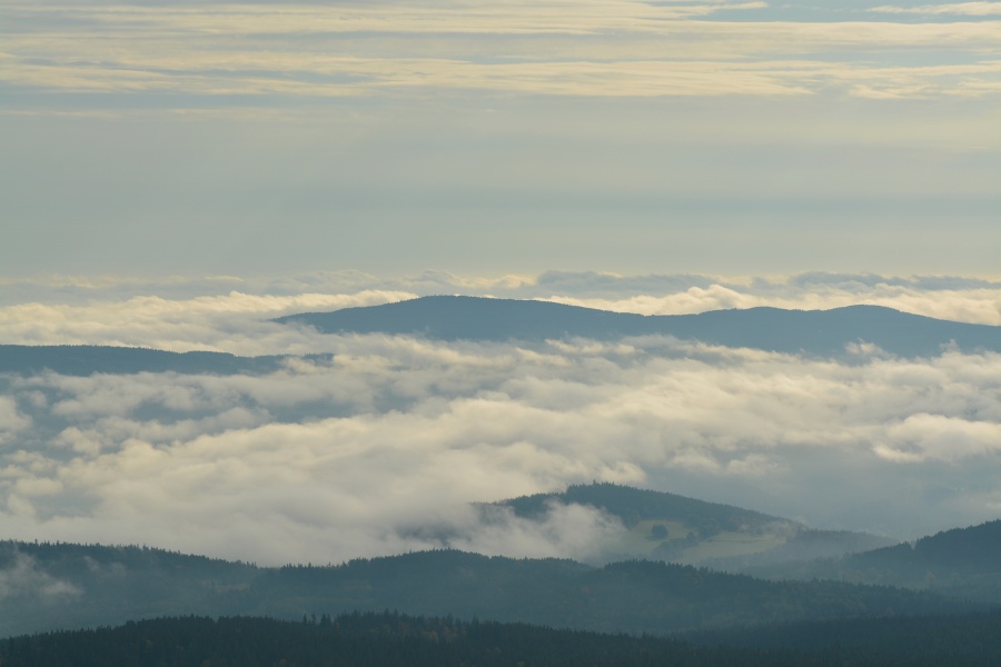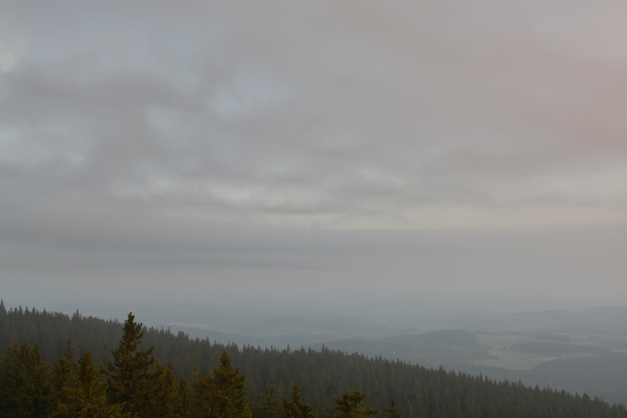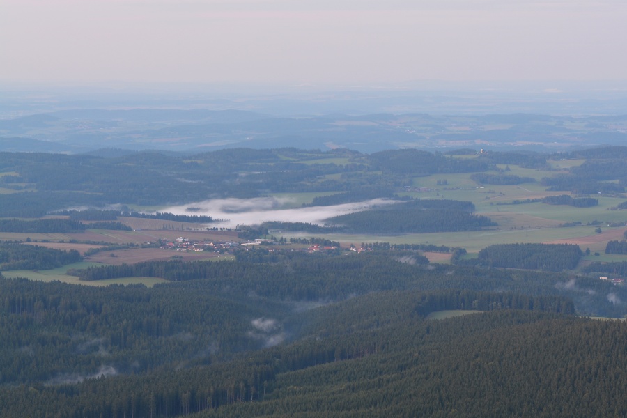 … že tradičně na Boubíně, odkud se nabízí za všudypřítomného, neustále proudícího jemného oparu mimo jiné pohled třeba na inverzí doslova zatopený Vltavský luh, přičemž Trojmezenská hornatina se na obzoru téměř ztrácí.
