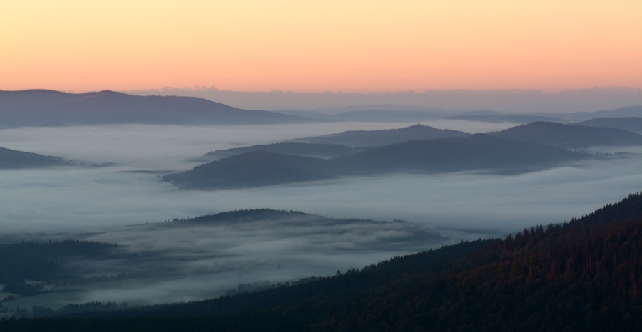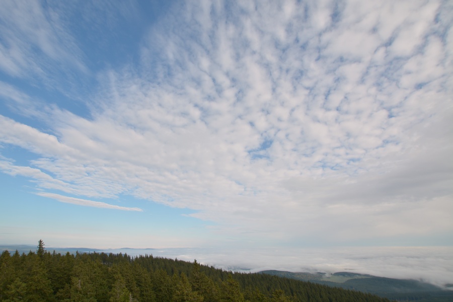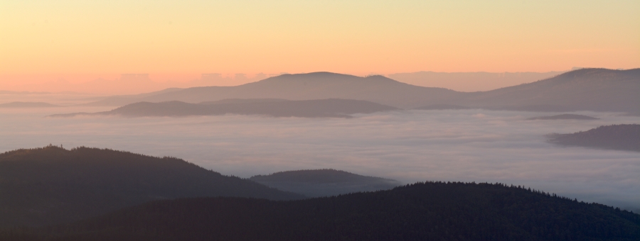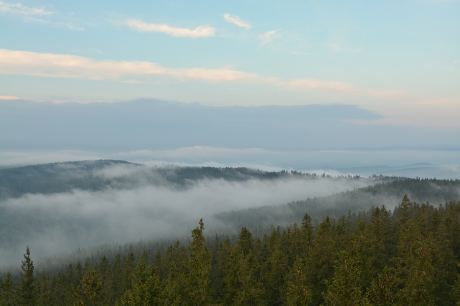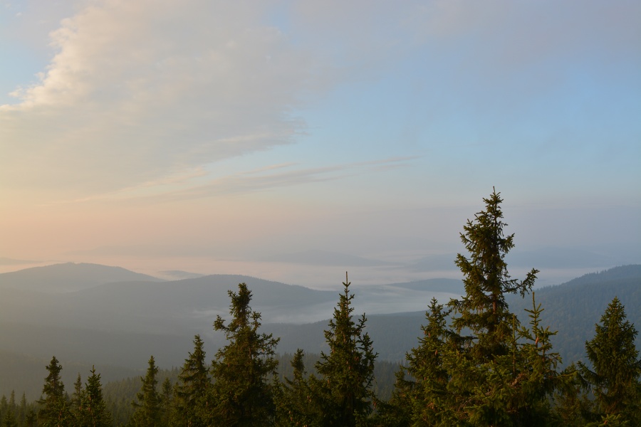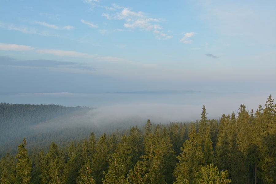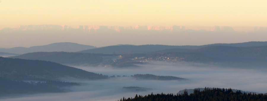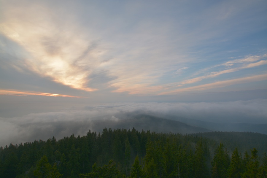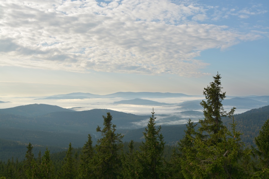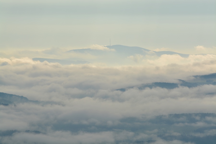 … že tradičně na Boubíně, odkud se nabízí za všudypřítomného, neustále proudícího jemného oparu mimo jiné pohled třeba na inverzí doslova zatopený Vltavský luh, přičemž Trojmezenská hornatina se na obzoru téměř ztrácí.