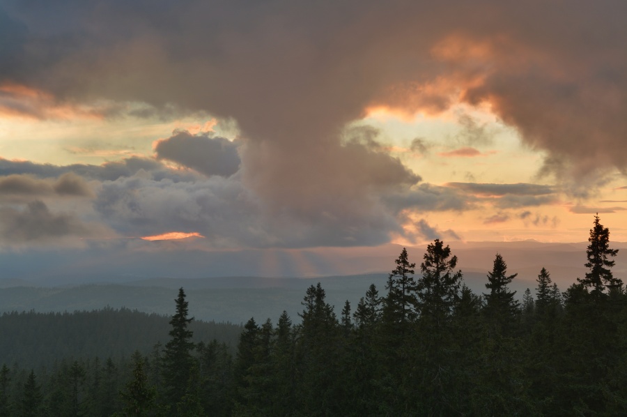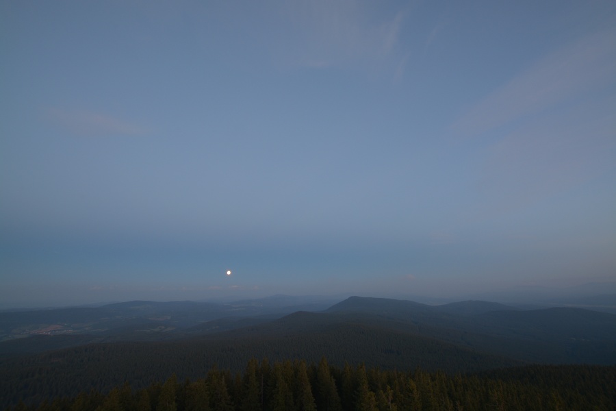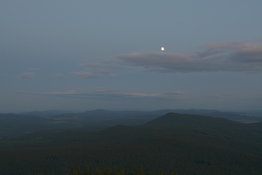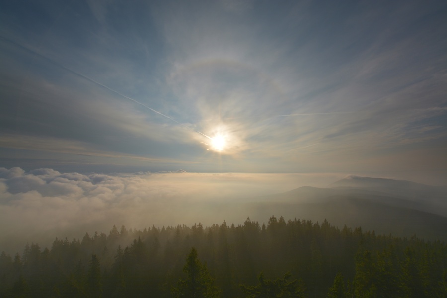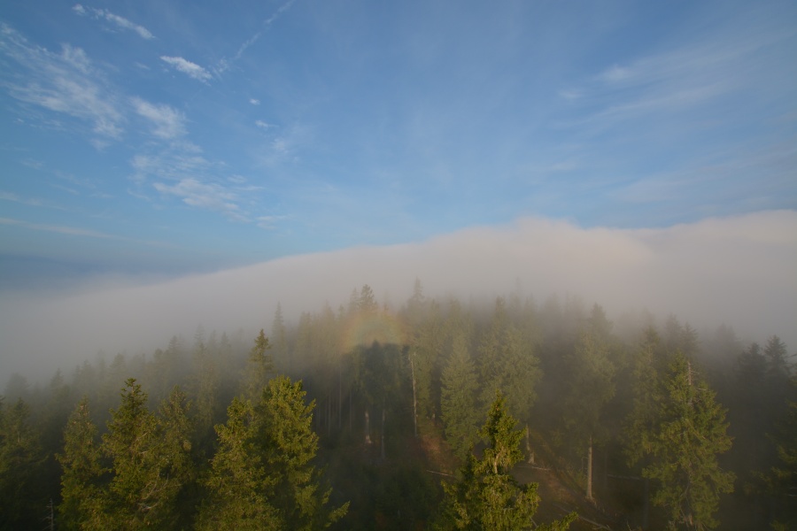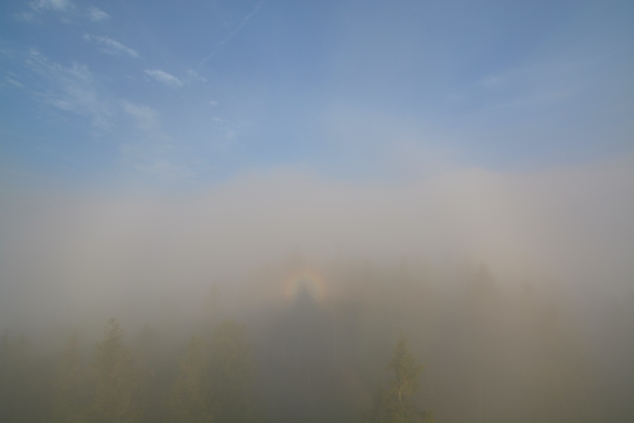… ale při druhém ohlédnutí již ano – a výsledkem je krásná gloriola, třebaže stín boubínské rozhledny již dávno sestoupil právě do zmíněných smrčin.