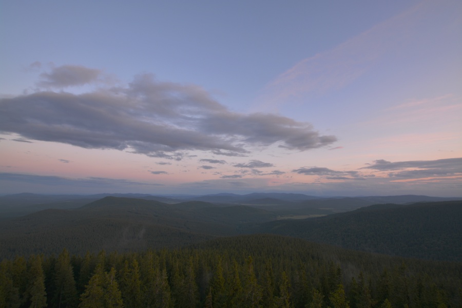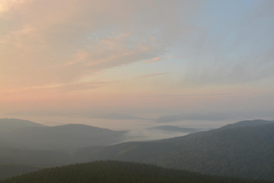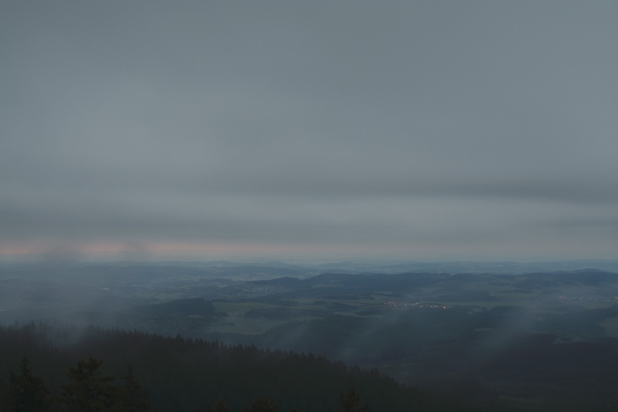 Předpovídané včerejší deštivo bylo nakonec souzeno končinám daleko na východ od Šumavy, ale noční obloha se po kompletně vydařené sobotě přece jen zatáhla a nepropustila k Vimperku ani hvězdičku. Tím pádem se i časně ranní výstup na Boubín jevil mnohem tajemnějším, neboť probíhal za větší tmy, k níž se navíc těsně pod vrcholem přidružila hustá mlha. Již od Basumských luk ke všemu střídavě zleva i zprava zaznívalo z přilehlých lesů mohutné jelení troubení, provázené drobným praskáním větviček, svědčícím o tom, že oba lesní králové stoupají stejnou rychlostí tímtéž směrem v nevelké vzdálenosti od cesty. Mlha a lesní chlad pro ně představovaly ideální konstelaci podmínek k hlasovému souboji, který ustal až na samotném vrcholu. Bylo možno předpokládat, že rozhledna dnes přinejmenším po páté hodině nebude lákat nikoho dalšího, leč na předposledním schodu pod vyhlídkovou plošinou vyšlo najevo, že jeden návštěvník sem přece jen dorazil podstatně dříve – s nemalou pravděpodobností tu setrvával již od večera, a byl tedy vlastně boubínským nocležníkem.