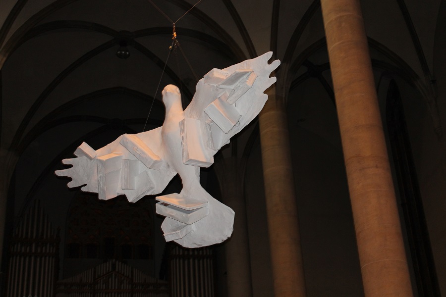 Sochařka Josefína Jonášová se rozhodla myšlenku projektu ztvárnit v podobě holubice, která na svých křídlech nese kufry. Setkávají se zde významy holubice jako symbolu Ducha svatého i jako symbolu míru a smíření. Vzpomínáme-li na odsun, pak vzpomínáme i na kufry, ve kterých si vyhnanci odnášeli svůj majetek. Holubice, biblický symbol Hospodinova míru, naznačuje, kterým směrem je možné se ke smíření dostat. Výtvarná instalace byla doposud k vidění v Praze, ve Filipově, v Brně a nyní se na několik následujících měsíců přesunula právě do Prachatic.