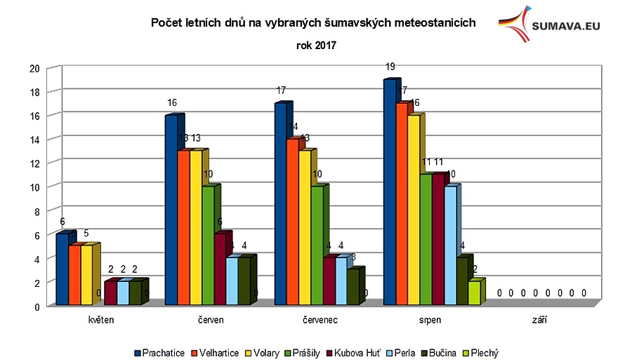 | Statistika počtu letních dnů na vybraných šumavských meteostanicích v roce 2017 | ||||||||||