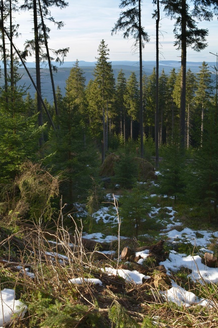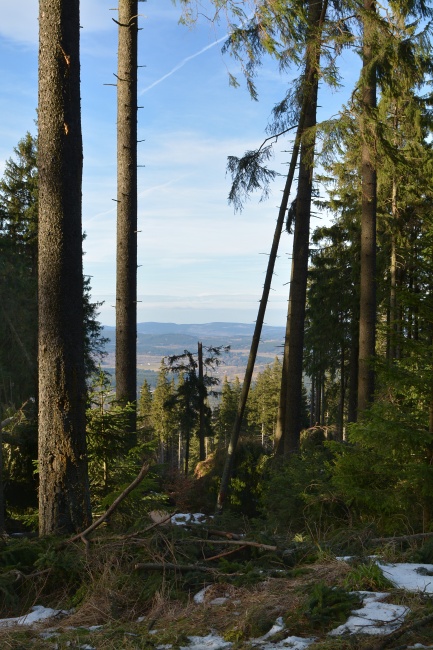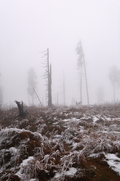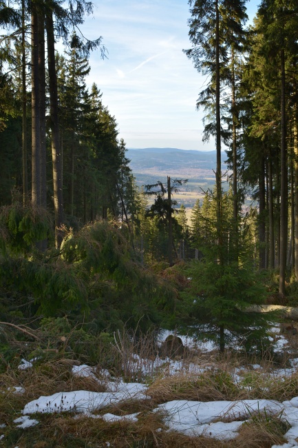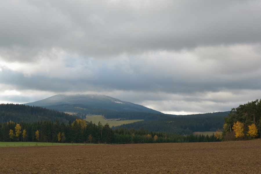 Nebýt hlášeny blížící se sněhové přeháňky, jimž také nasvědčuje vývoj na obloze, namísto slabounce viditelného boubínského úbočí by tomuto záběru dominovala celá majestátní hora, nade vší pochybnost již z valné většiny v bílém kabátě.