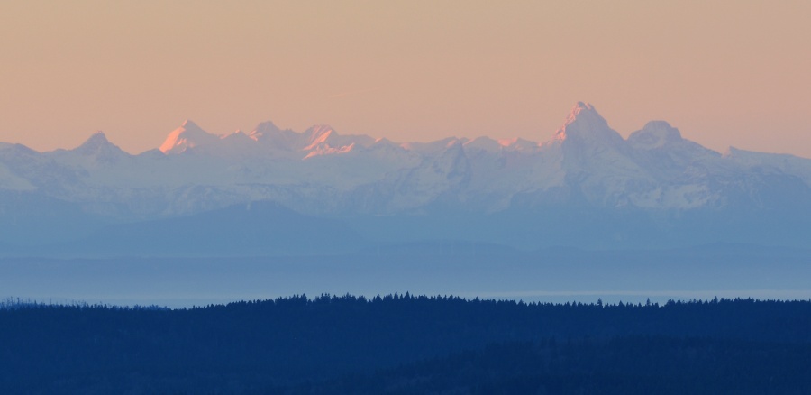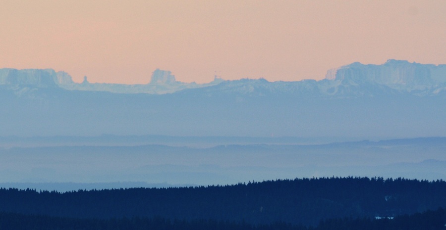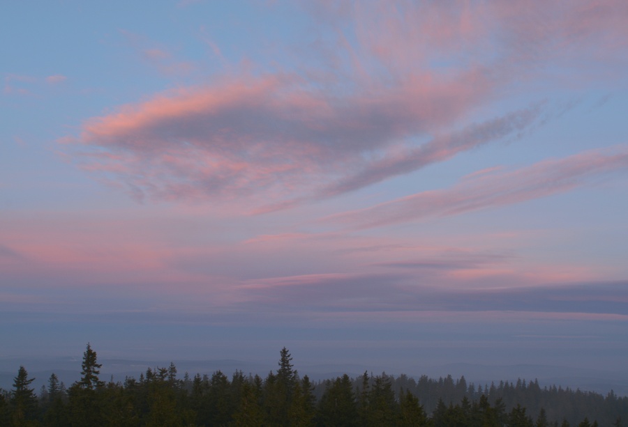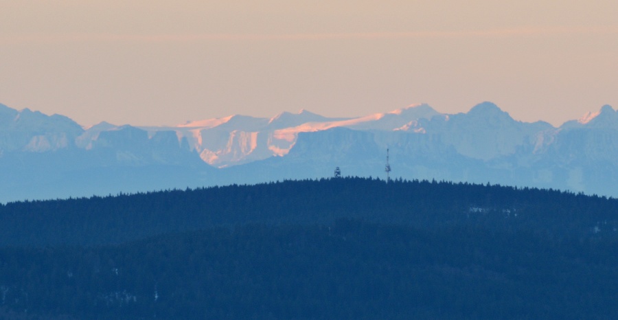 Na rozhledně sice poměrně výrazně fouká, leč teplota se drží na příjemných sedmi stupních nad nulou – po říjnovém prvním sněhu nebylo už cestou vzhůru ani památky. Hned je také vidět, že po celém obzoru jsou uchystány oblačné překážky, jejichž vinou patrně nebude možno sluníčko uvítat od samého počátku v plné kráse. Na druhé straně nicméně potěšily slabé obrysy Alp.