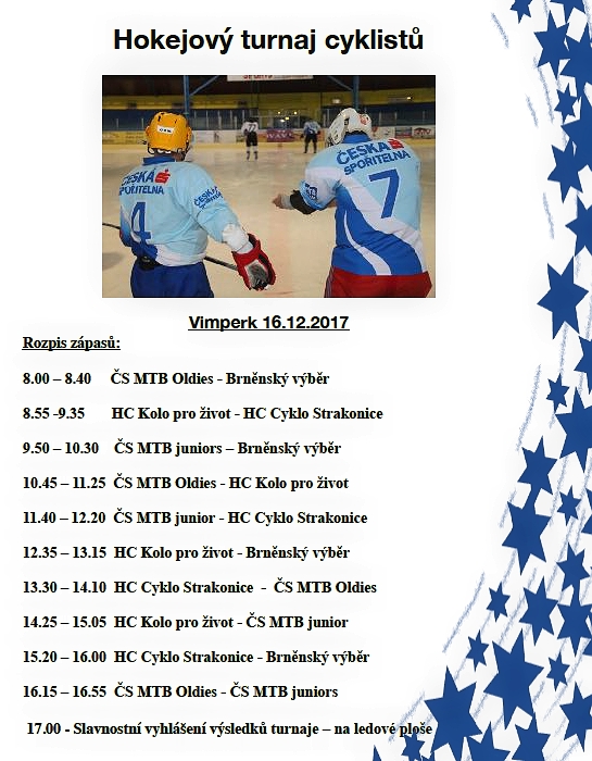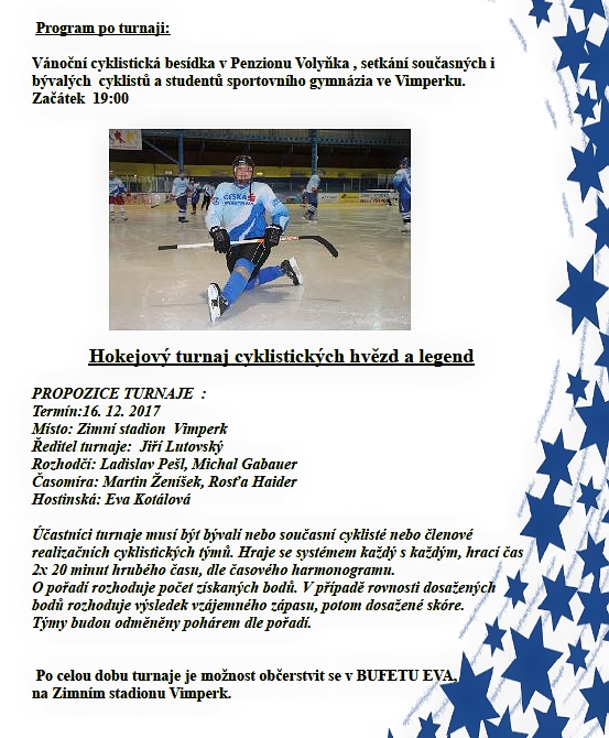 Současné i bývalé hvězdy a legendy cyklistického sportu Vimper(s)ka si dají sportovní dostaveníčko v sobotu 16. prosince, na tradičním Hokejovém turnaji cyklistů.