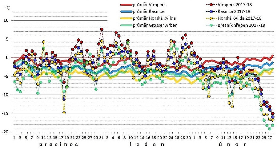 Teplota vzduchu v různých polohách Šumavy v průběhu klimatologické zimy 2017/2018