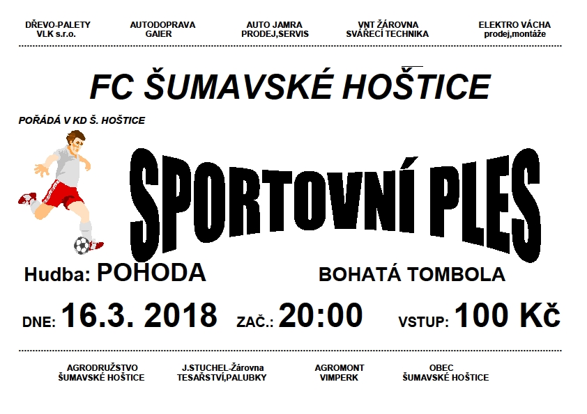 Pohybem k dobré náladě – to platí v sobotu 16. března dvojnásob, protože hýbat a bavit (a možná i sportovat – záleží jak kdo tanec bere) se můžete se sportovci z FC Šumavské Hoštice na sportovním plese. Hudba kapely Pohoda, bohatá tombola a příjemná společnost jsou zárukou příjemného večera!