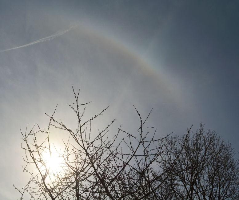 Podobně jako včerejší rozloučení se sluníčkem, odehrálo se i jeho dnešní přivítání za přítomnosti krásného a nebývale zřetelného pravého parhelia, navíc ve velmi zajímavé oblačné sestavě.