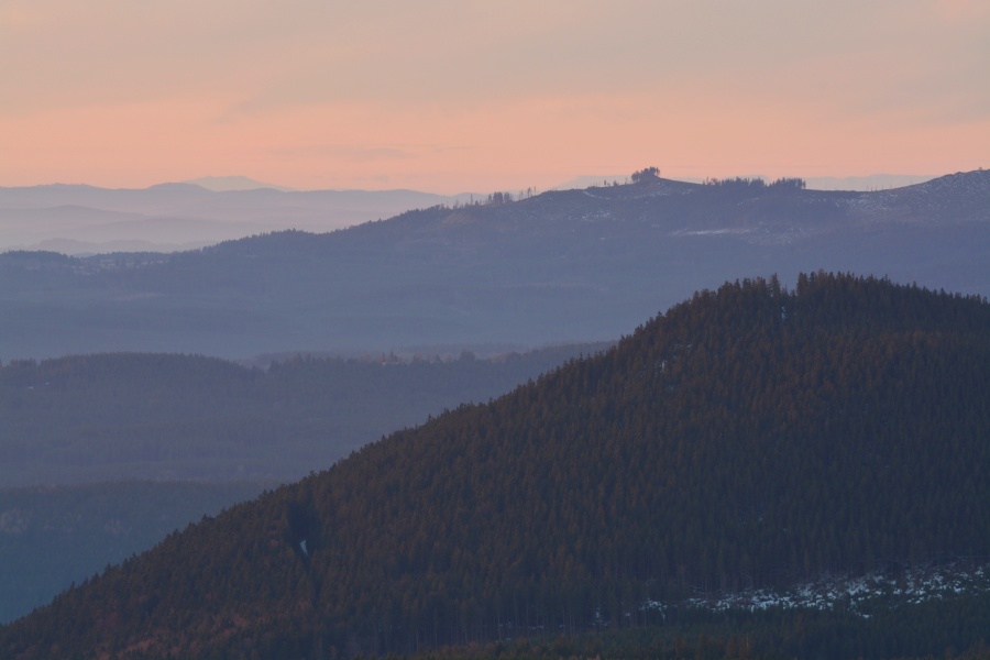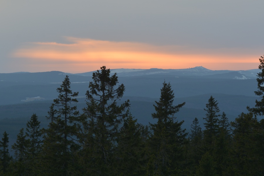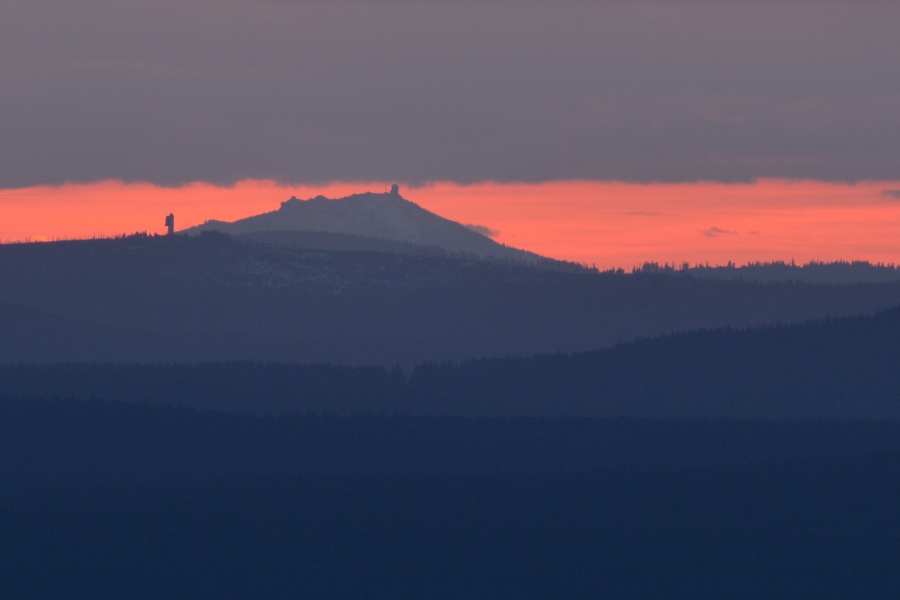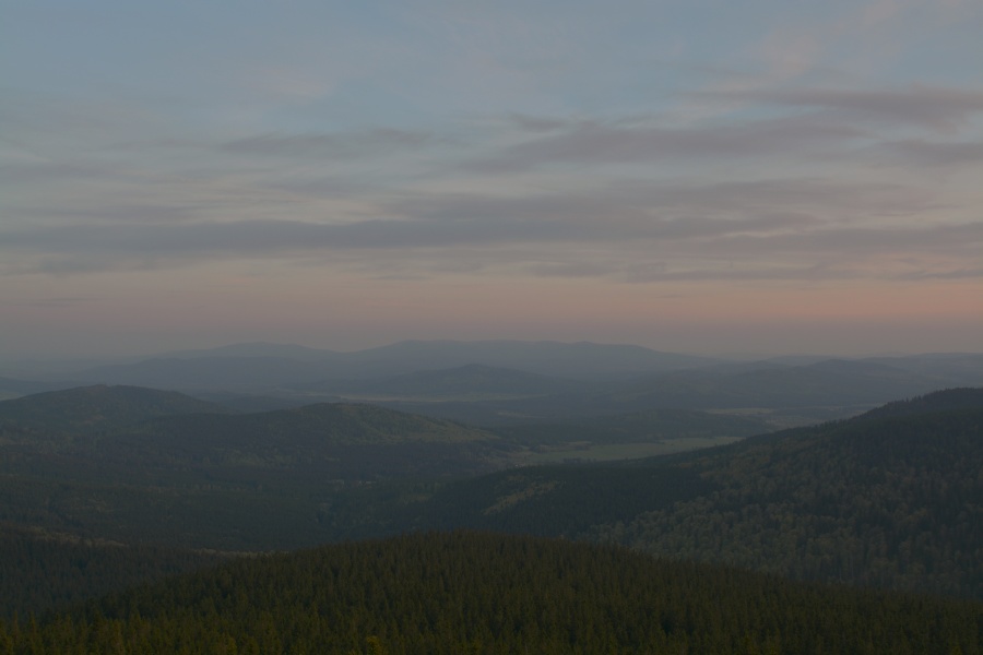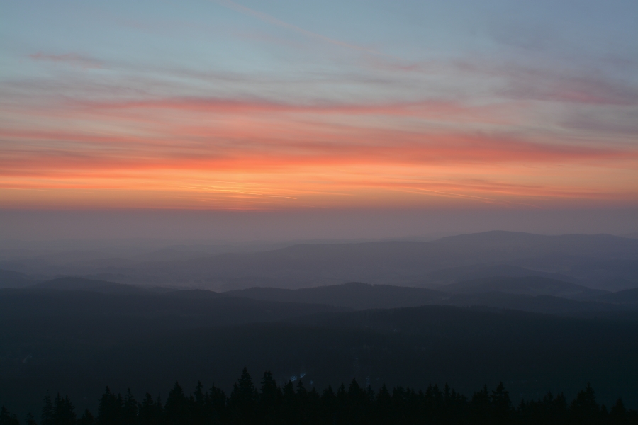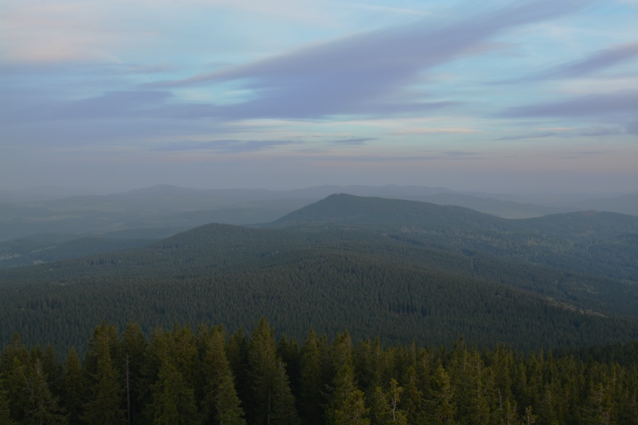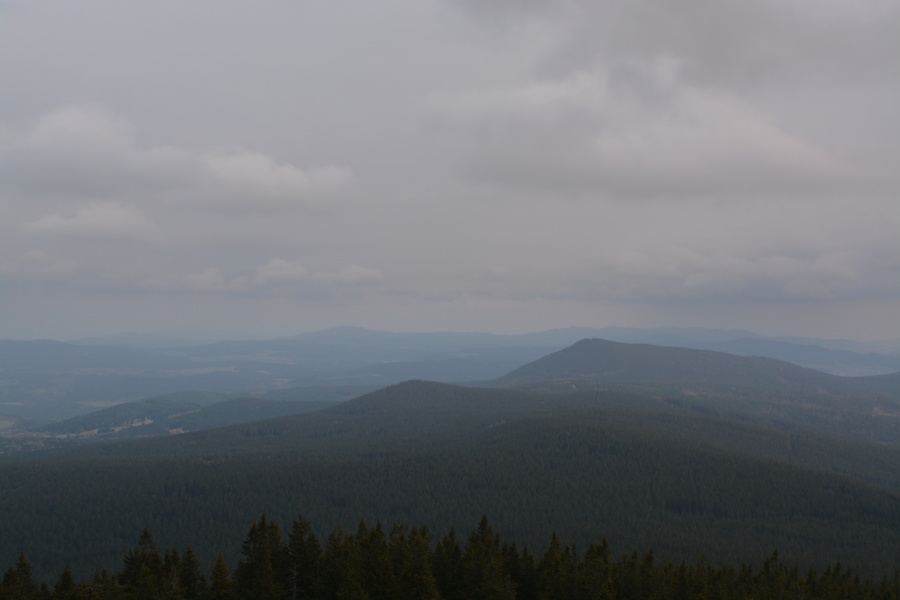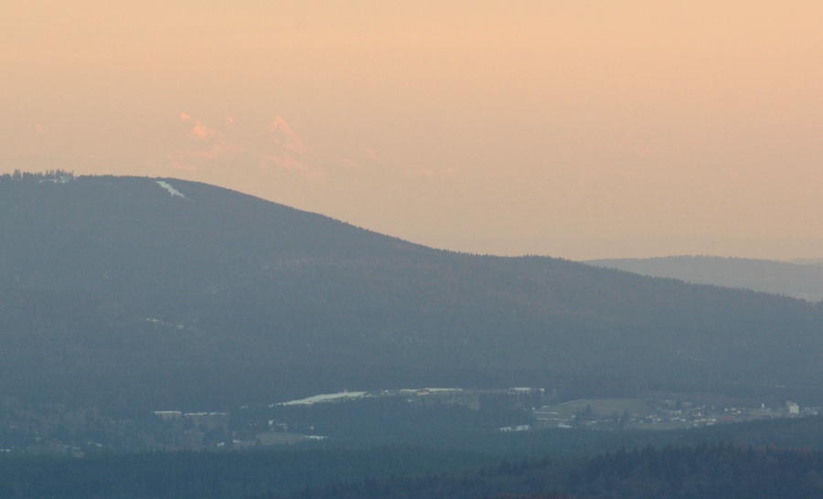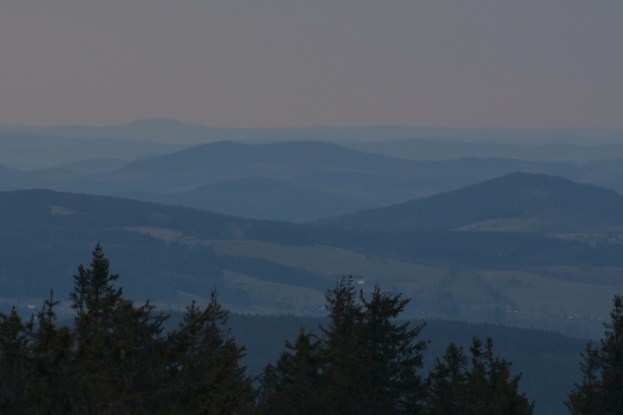 … do jehož kouzel zapadá i takto dokonale za Javorníkem viditelný Slavkovský les s báječně čitelnými vrcholy počínaje Kružným /863 m n.m., od Boubína 145,3 km/ přes Hill /957 m n.m., 145 km/, nejvyšší Lesný /983 m n.m., 145 km/, Lysinu /982 m n.m., 142,2 km/, Vlčí kámen /883 m n.m., 139,8 km/ až k výraznému Podhornímu vrchu /825 m n.m., 132,9 km/, který už ovšem náleží k Tepelské vrchovině, součásti Krušnohorské hornatiny.