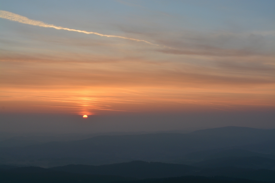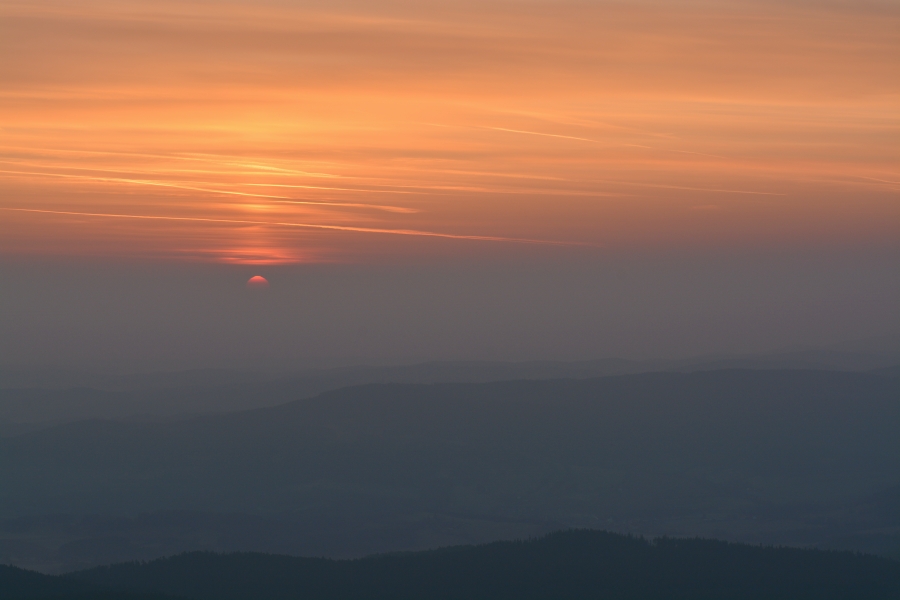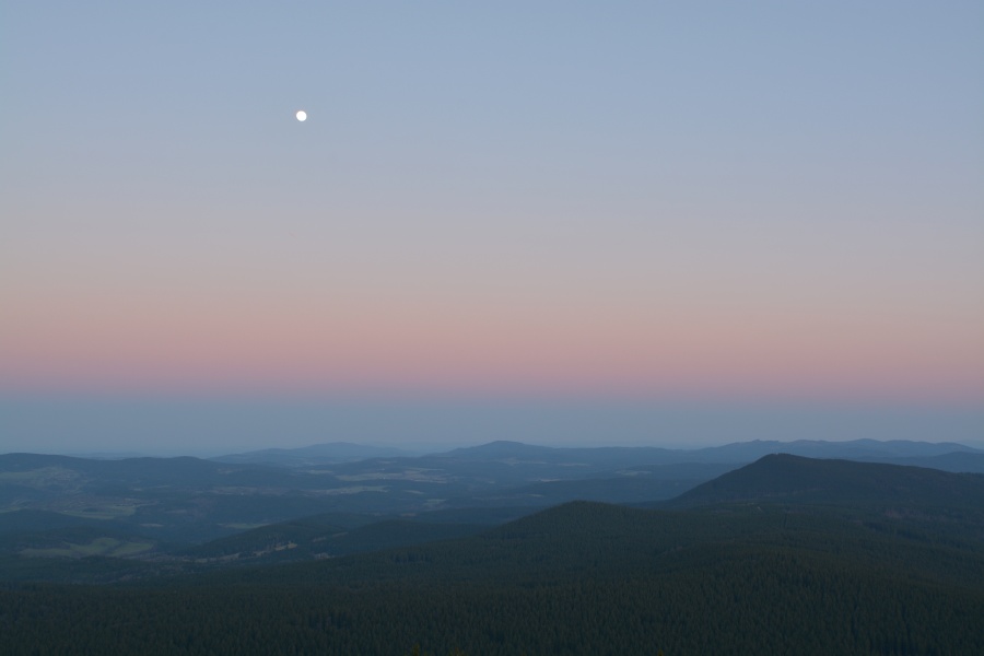 Cestu vzhůru však navzdory popsané situaci povětšinou provázel úspěšně vítězící měsíční svit, jehož původce se nakonec takto zanořil do silného pásu obzorového oparu, aniž tak dostal příležitost pozdravit se ještě s vycházejícím sluníčkem.