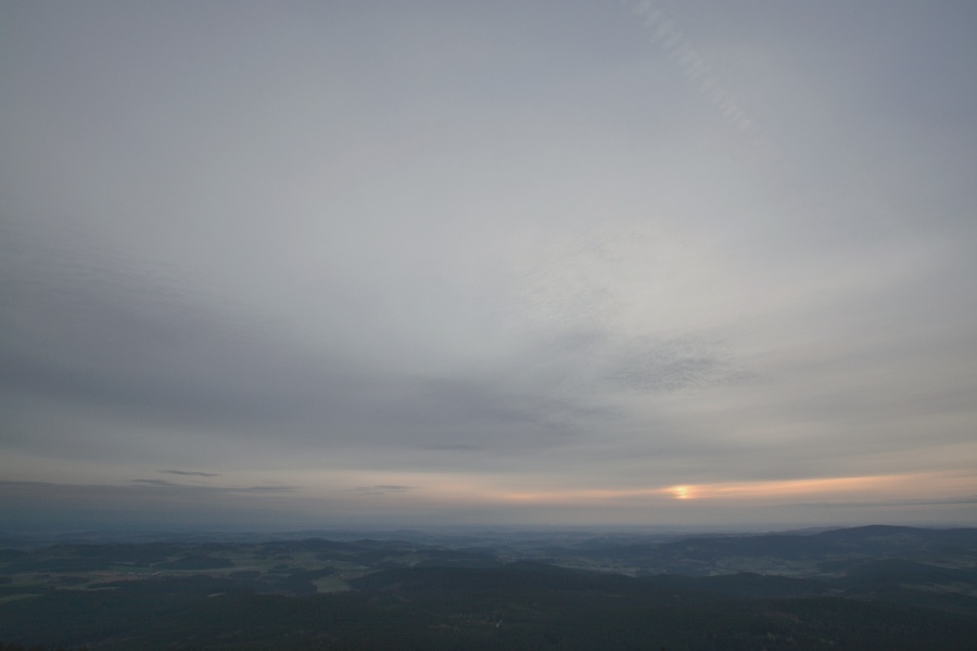… pak by jeho název klidně mohl znít „Měsíc zelených záblesků“. Tolik se jich tu totiž na tak malém časovém úseku snad ještě nikdy nenakoncentrovalo (viz dále 15., 14., 7. a 6. dubna), což může autor fotokroniky potvrdit z pozice člověka nacházejícího se v druhé tisícovce výstupů na Boubín. Dnešní ráno se přitom tvářilo jako celkovou náladou velmi podobné předvčerejšímu – a shodné rysy tu dozajista byly. Jenomže obzorový opar a celá struktura přítomné oblačnosti přece jen vykazovala odlišný charakter, …