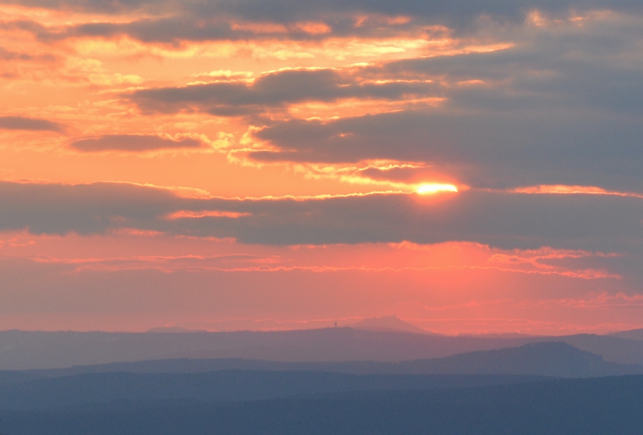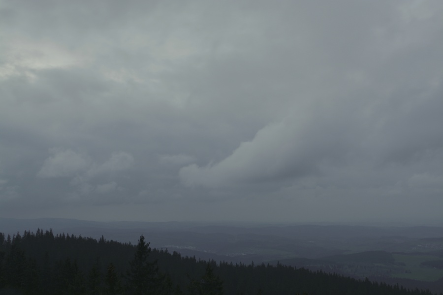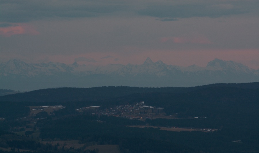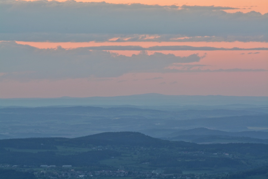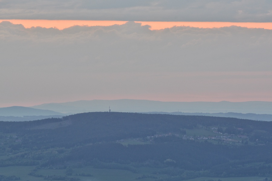 … abychom se i tady pokochali famózní dohledností a ostrostí Božidarského Špičáku /1115 m n.m., 170,4 km/ či dominantního Klínovce /1244 m n.m., 167,7 km/, mezi nimiž lze blíže k prvému identifikovat též Vysokou pláň /890 m n.m., 145,8 km/, součást Doupovských hor. Můžeme si připomenout, že tutéž vzdálenou horskou partii jsme odtud měli možnost spatřit např. předloňského silvestrovského jitra ( viz http://vimperk.eu/index.php/vimperk/11415), ba dokonce s atmosférickým zrcadlením nad Klínovcem, avšak dnešní brilanci se tehdejší viditelnost, jak snadno zjistíme, nevyrovná. Za tak bohaté nadílky tedy nakonec jistě pro tento večer oželíme déšť, který se snad stane již májovou záležitostí 🙂 .
