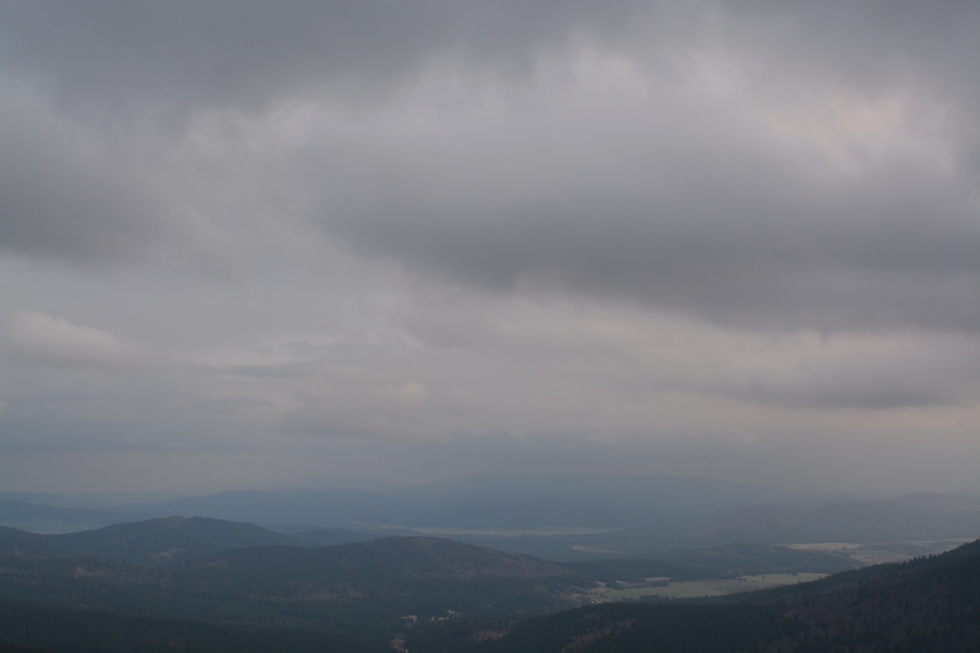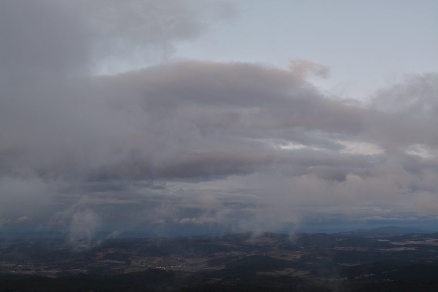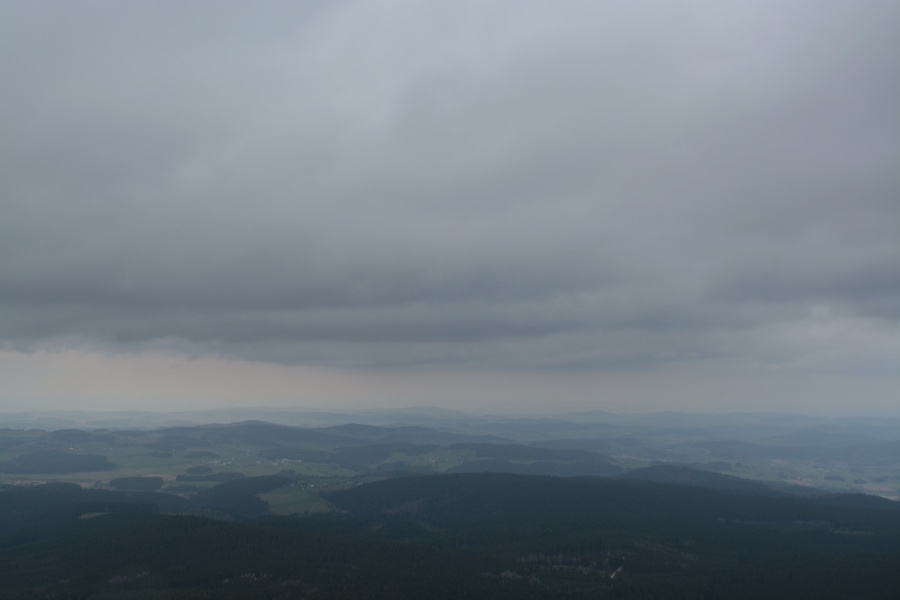 V průběhu uplynulé noci celkem dvakrát jemně zaťukaly na vimperské střechy dešťové kapky. Nestačily sice ani na plné smočení bohatých nánosů pylu, natož aby je snad spláchly, ale rozhodně prozradily, že na obloze nebývale zhoustla oblačnost, což pak ranní Boubín konkretizoval do zde viditelné podoby.