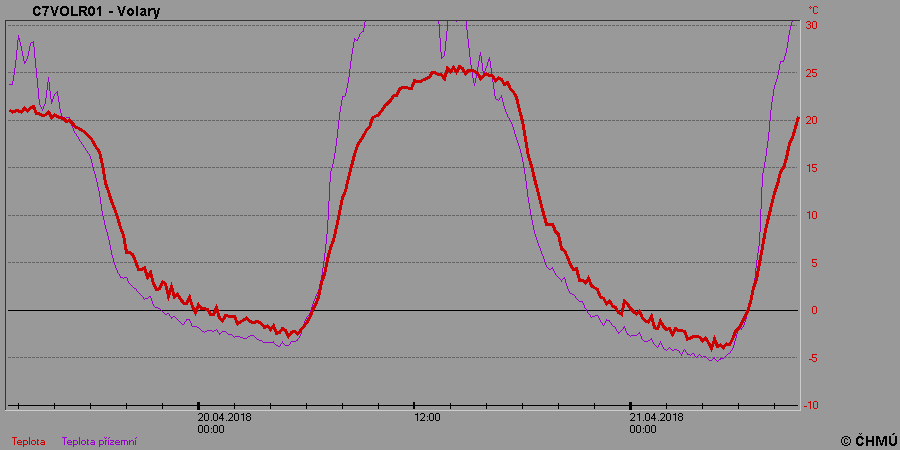 Teplotní graf prvního letního dne roku 2018, meteostanice Volary, Budějovická ul., amplituda 28,7°C: