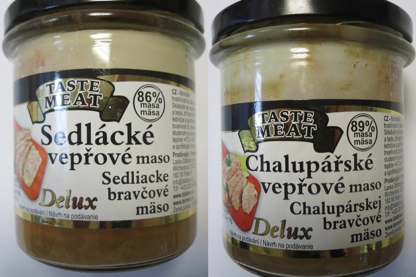 TASTE MEAT Sedlácké vepřové maso, hmotnost 300 g, číslo šarže: 23.03.2021, Partia 19 , DMT: 23.03.2021, prodávající (dovozce): Laska Dalboss spol. s r.o., Wichterlova 2372/10, 182 00 Praha 8, země původu: EU. Na etiketě potraviny byla uvedena informace 86% masa, laboratorním rozborem byl zjištěn obsah masa 74,3%.