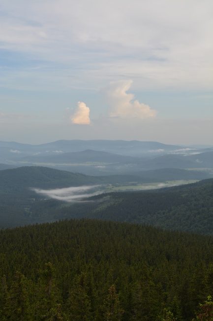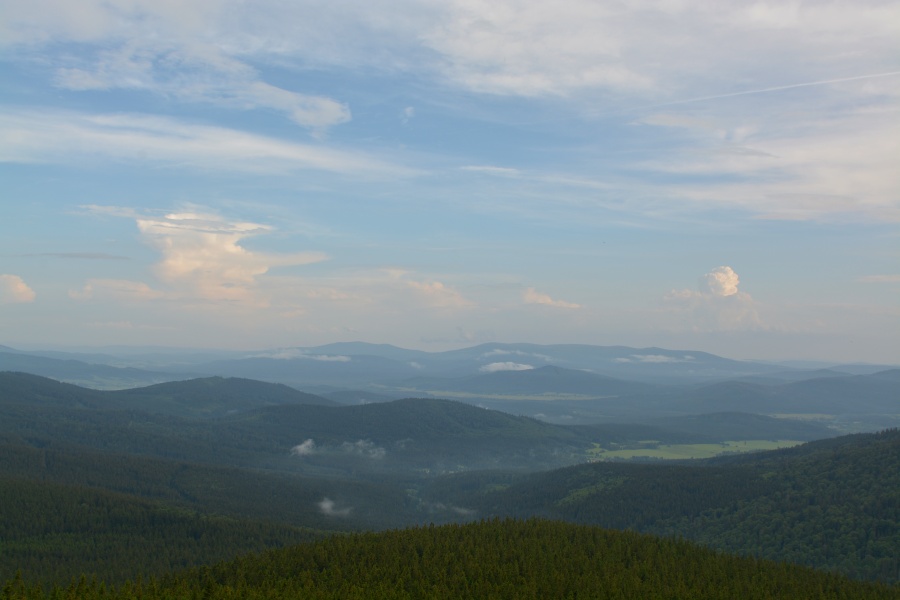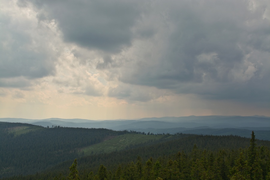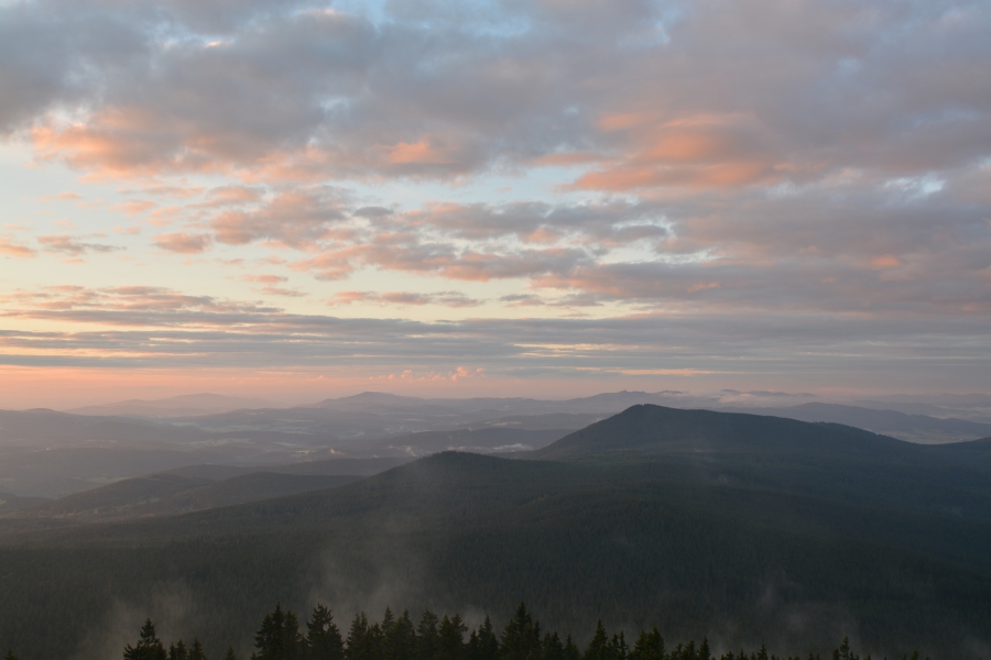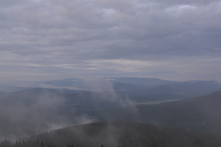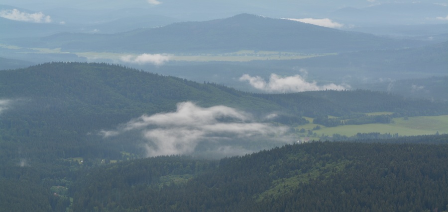 Ještě posledního červnového pondělního rána byla šumavská panoramata poznamenána následky celonočních dešťů, ale současně už se nezapřel posun příznivějším směrem.