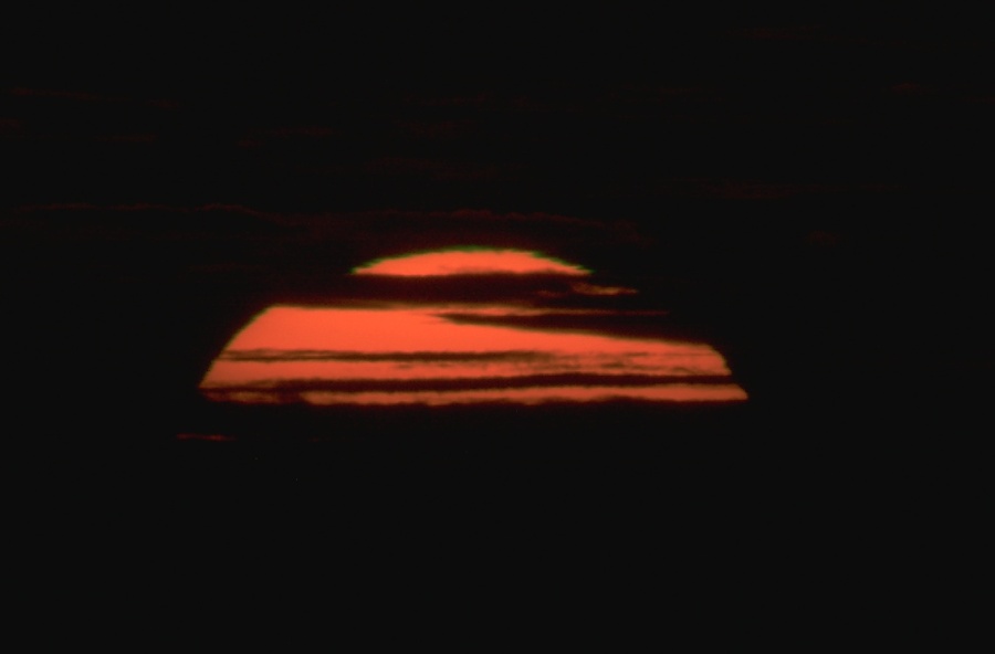 Jinak dokonale čistou oblohu lemoval mírným oparem zastřený obzor, což mělo za následek nepatrné koketování zapadajícího sluníčka se zelenými záblesky.