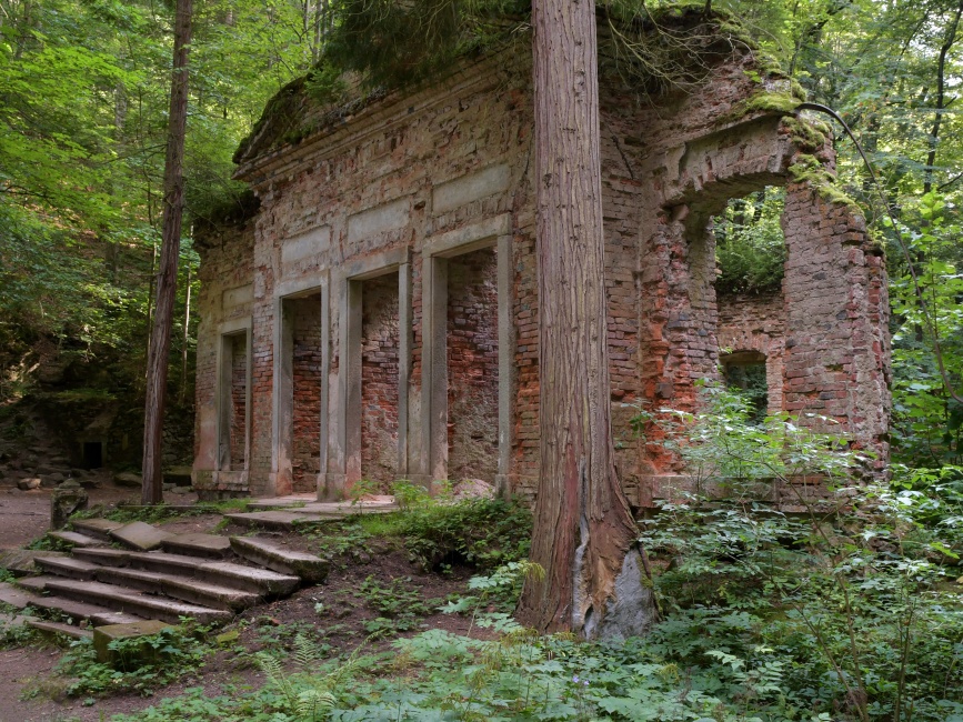 Citovaný deníkový záznam vyzdvihuje též dům, který kněžnu Paulinu bezesporu silně zaujal. Dnes z něj bohužel zůstaly jen ruiny, z nichž nicméně hned na prvním dnešním snímku můžeme stále vyčíst klasicistní charakter. Nazýval se „Modrý dům“ – podle netradiční barvy nátěru šindelové střechy – a sloužil jako letní sídlo hraběnky Terezie Buquoyové, která si jej k tomu účelu nechala přestavět z prapůvodního hudebního salonu. V roce 1936 však ničivá povodeň strhla jeho severozápadní křídlo (historie nám praví, že tomuto živlu nejednou vzdoroval i v průběhu předchozích staletí) a od těch dob již jen chátral až do dnešní vpravdě mysteriózní podoby.