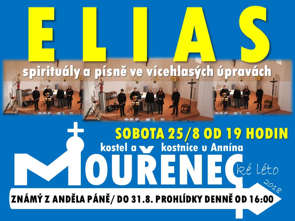Tentokrát se v sobotu 25.8. od 19 hodin můžete těšit na klatovskou skupinu Elias. Pavel Koura a další muzikanti a zpěváci příždí do kostela sv. Mořice na Mouřenci nad Annínem se spirituály a dalšími písněmi ve vícehlasých úpravách.