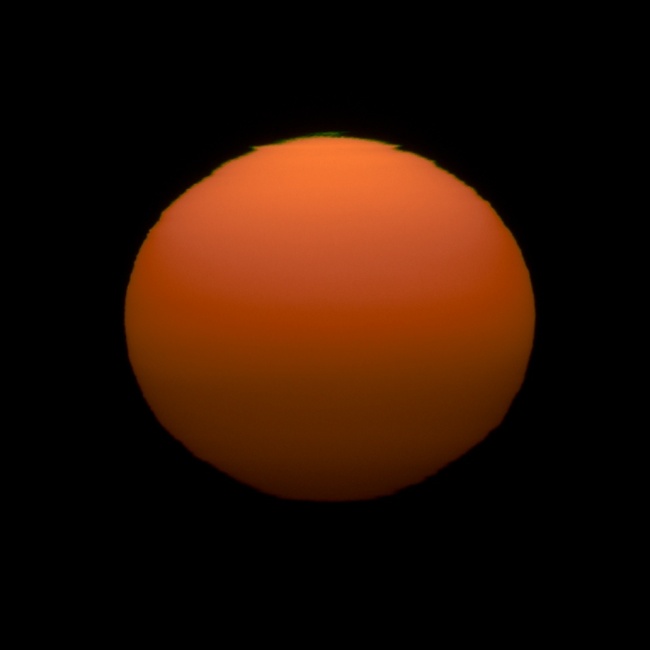 … vymezenou již zmíněnou růžovou linkou, dostalo – konkrétně ohraničenou časy 06:34:58 (vyšlo) a 06:42:40 (zmizelo v úkrytu za mraky).