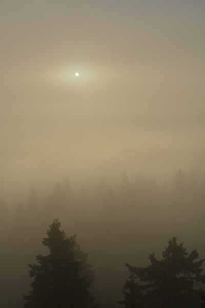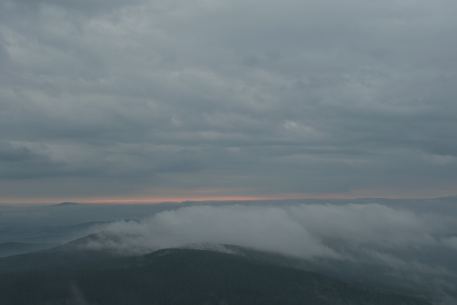 Podzim se rozhodl vkročit na scénu skutečně stylově – tedy od samého počátku nám připomenout, že jeho doménou jsou mlhy, plískanice, sychravo … ale nějaké sluníčko přece také. Dnes vyšlo dokonce přesně na východě, což však nebylo možno z Boubína sledovat. A přitom celá cesta vzhůru, během níž se na rozdíl od včerejška zase ozvalo z lesů slabé jelení troubení, byla prosta jakékoli mlhy. Ze zatažené oblohy sice chvílemi drobně pršelo, ale orografická čepice přišla ke slovu teprve na samotném vrcholu – ba zprvu se zdálo, že o něj jen škrtne a zase odlétne. Co naplat, usadila se, a to pevně. Světlejších míst, jak vidíme na snímku, by člověk za celé ráno napočítal velmi poskrovnu.