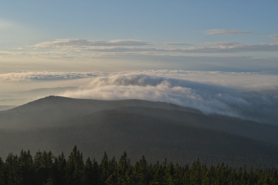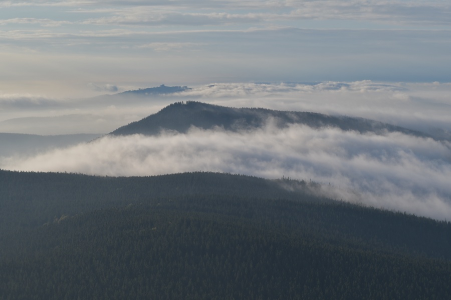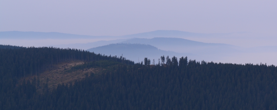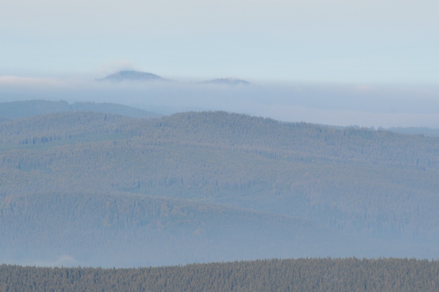 … a po něm dokonale ukrytá Trojmezenská hornatina s klamným, zcela falešným oblačným novotvarem nad téměř dokonale jím napodobenou Smrčinou.