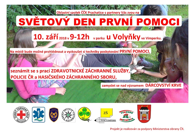 Stanoviště s ukázkami první pomoci připraví ČČK ve spolupráci se ZŠ Smetanova, ZŠ TGM a ZŠ Stachy. Dále bude možné prohlédnout si vozy a techniku ZZS, HZS i Městské policie, dozvědět se bližší informace o dárcovství krve. Akci podporuje Město Vimperk a Ministerstvo obrany.