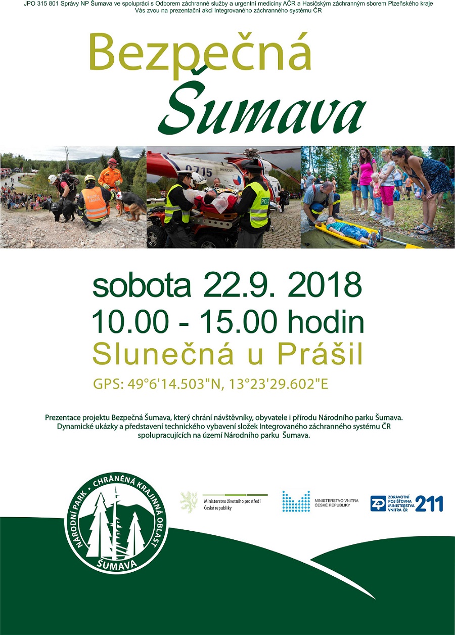 Zveme vás na akci Bezpečná Šumava, která se koná 22. září 2017 ve Slunečné u Prášil v době od 10:00 do 15:00 hodin.