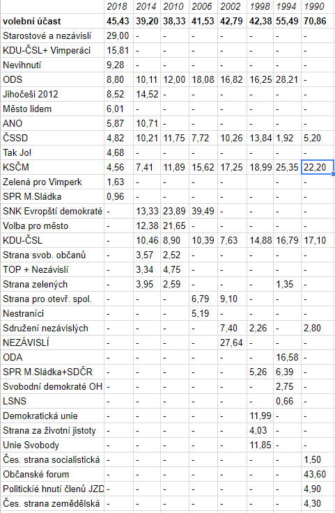 historievolbyKomunální volby 2018 jsou za námi a znají své vítěze a poražené. Jednoznačnou vítězkou se stala Jaroslava Martanová. Obdržela 1463 hlasů, což je druhý nejlepší výsledek v novodobé historii města. Více měla jen Stanislava Chumanová v roce 2006. Tehdy ji volilo  1566 Vimperáků.  Velmi pravděpodobná budoucí starostka Martanová své hnutí Starostové a nezávíslí vytáhla k metě třiceti procent a z nich ve výsledku plynoucích šesti zastupitelů. Dalším velkým vítězem jsou v pořadí druzí Vimperáci s podporou KDU-ČSL. Třetím nesporným vítězstvím je obdivuhodný úspěch zcela nového hnutí „Nevihnutí“ s téměř deseti procenty. Sympatického výsledku pak dosáhlo též nové uskupení  „Tak jo!“, jemuž chybělo jen několik málo hlasů k dosažení mandátu a dopadlo přitom v podstatě stejně jako tradiční republikové strany ČSSD a KSČM, které ale jistě čekaly mnohem víc. Tím se dostáváme k poraženým. Prvním je ČSSD, jejíž lídr se z dosavadního postu radního dostává mimo zastupitelstvo. Druhým poraženým je KSČM, která symbolicky den po nedožitých osmdesátých pátých narozeninách Václava Havla po téměř stoleté účasti taktéž mizí z vimperské komunální politiky. Řadu poražených dále doplňuje hnutí ANO, jež se z republikových třiceti procent propadlo na necelých šest a ODS ,která ve Vimperku dosáhla svého nejhoršího výsledku v historii . Za největší poražené je však nutno považovat ambiciózní Jihočechy 2012, kteří jako momentálně vládnoucí strana na radnici a jako vítěz posledních voleb 2014 byli hlavním favoritem voleb. Nakonec skončili až pátí a právě končící starosta ani nebyl zvolen zastupitelem.