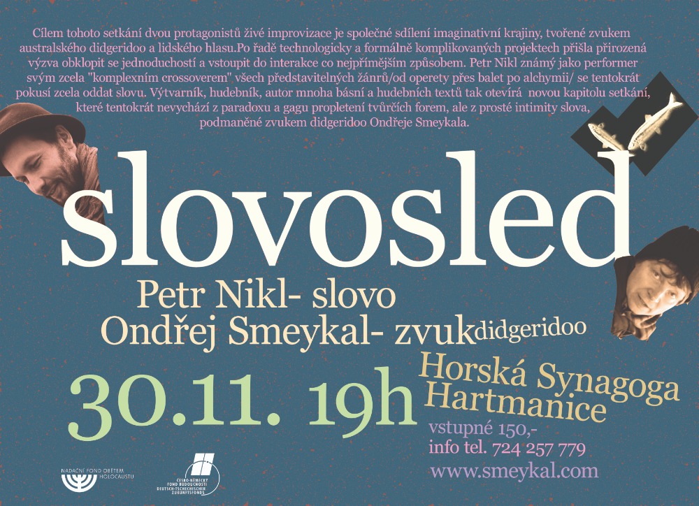 Akce s názvem Slovosleď, která se uskuteční v hartmanické synagoze v pátek 30. listopadu od 19 hodin, je improvizovaným večerem poezie výtvarníka Petra Nikla za zvuku didgeridoo Ondřeje Smeykala.