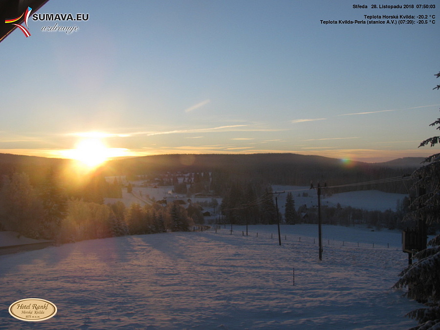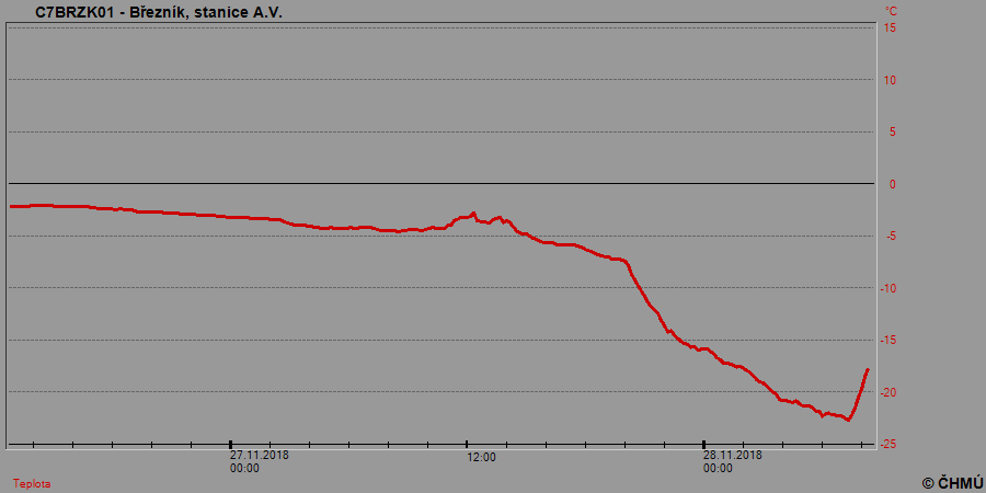 Teplota 28. listopadu klesla na některých šumavských stanicích poprvé v této zimě pod hranici -20°C. Naposledy byl takto silný mráz v listopadu naměřen v roce 2010 na Rokytské slati. Podmínky pro pokles teploty nebyly až na oblast Březníku vůbec ideální, nad Šumavou se vytvořila nízká oblačnost, která znemožnila větší pokles teplot. Až nad ránem došlo téměř na celé Šumavě k vyjasnění.