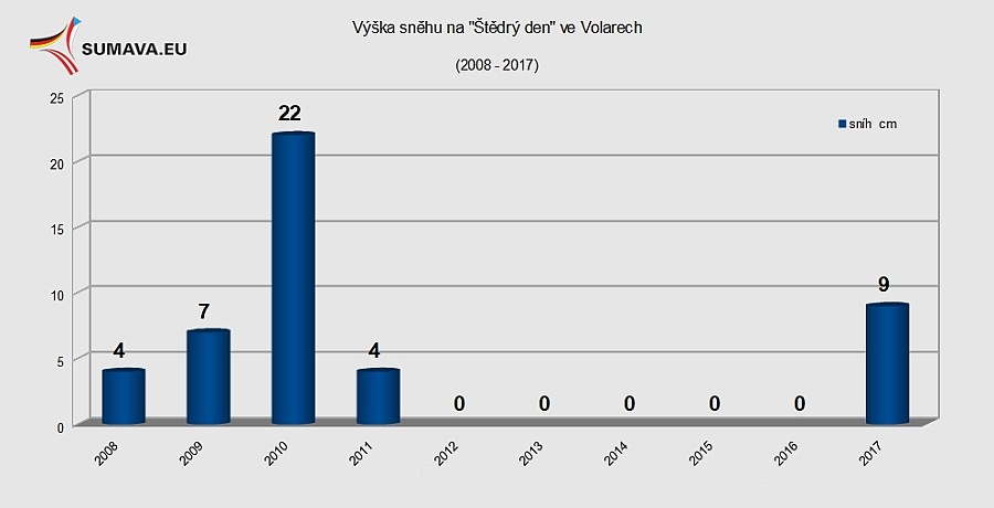 Pokud se podíváme na sněhovou pokrývku, která zajímá na Vánoce snad každého, zjistíme, že sníh ležel v 50% případů. Zajímavější ale je ještě fakt, že ve čtyřech letech byla sněhová pokrývka pouze do 10 cm a pouze v jednom roce leželo ve Volarech 22 cm sněhu. Znamená to tedy, že ani v nadmořské výšce 760 metrů nad mořem není na Šumavě v posledních letech jistota bílých Vánoc.