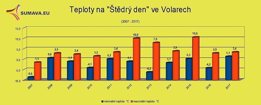 V tomto článku se zaměříme na Štědré dny ve Volarech, přesněji na roky 2007 až 2017. Pro srovnání využijeme data z meteostanice umístěné v centru Volar, která měří teploty od roku 2007 a sněhovou pokrývku od roku 2008. Co se týče teplot, zjistíme, že za posledních 10 let byl pouze jediný ledový „Štědrý den“ a to v roce 2007, kdy maximum dosáhlo na -1,5°C. Ve všech následujícíh letech se teplota vždy dostala nad bod mrazu. Vyskytly se ale i takové roky a to celkem 4 z 10, kdy naopak teplota vůbec nespadla pod nulu, tedy nebyl zaznamenán ani mrazový den. Dvakrát za 10 let dokonce teplotní denní maximum vystoupilo na 10°C. Nejnižší teplota byla naměřena v roce 2007, kdy na Štědrý den bylo minimum ve městě -8,6°C.
