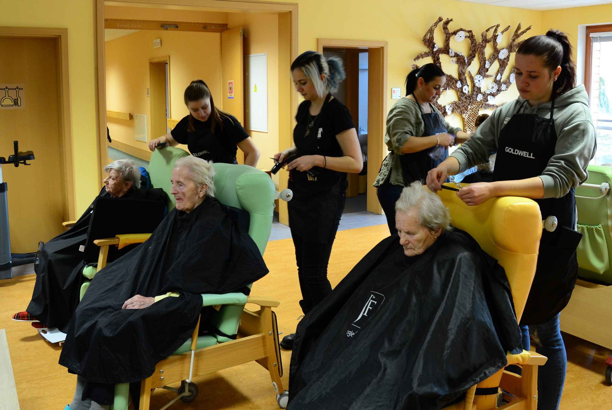 Žáci oboruKadeřník – vizážista pod dohledem učitelů odborného výcviku dochází pravidelně za klienty Domova Matky Vojtěchy, které stříhají, holí, češou i barví. Mnohým dámám zajišťují také kosmetické služby, zejména pak úpravy pleti. „Jsem moc rád, že tato spolupráce vznikla, neboť vidím, že má smysl nejen po stránce odborné, ale především po stránce sociální“, uvedl vedoucí učitel odborného výcviku pan Antonín Olah. Žáci se kromě procvičení odborných dovedností také naučí jednat se seniory a nemocnými lidmi.