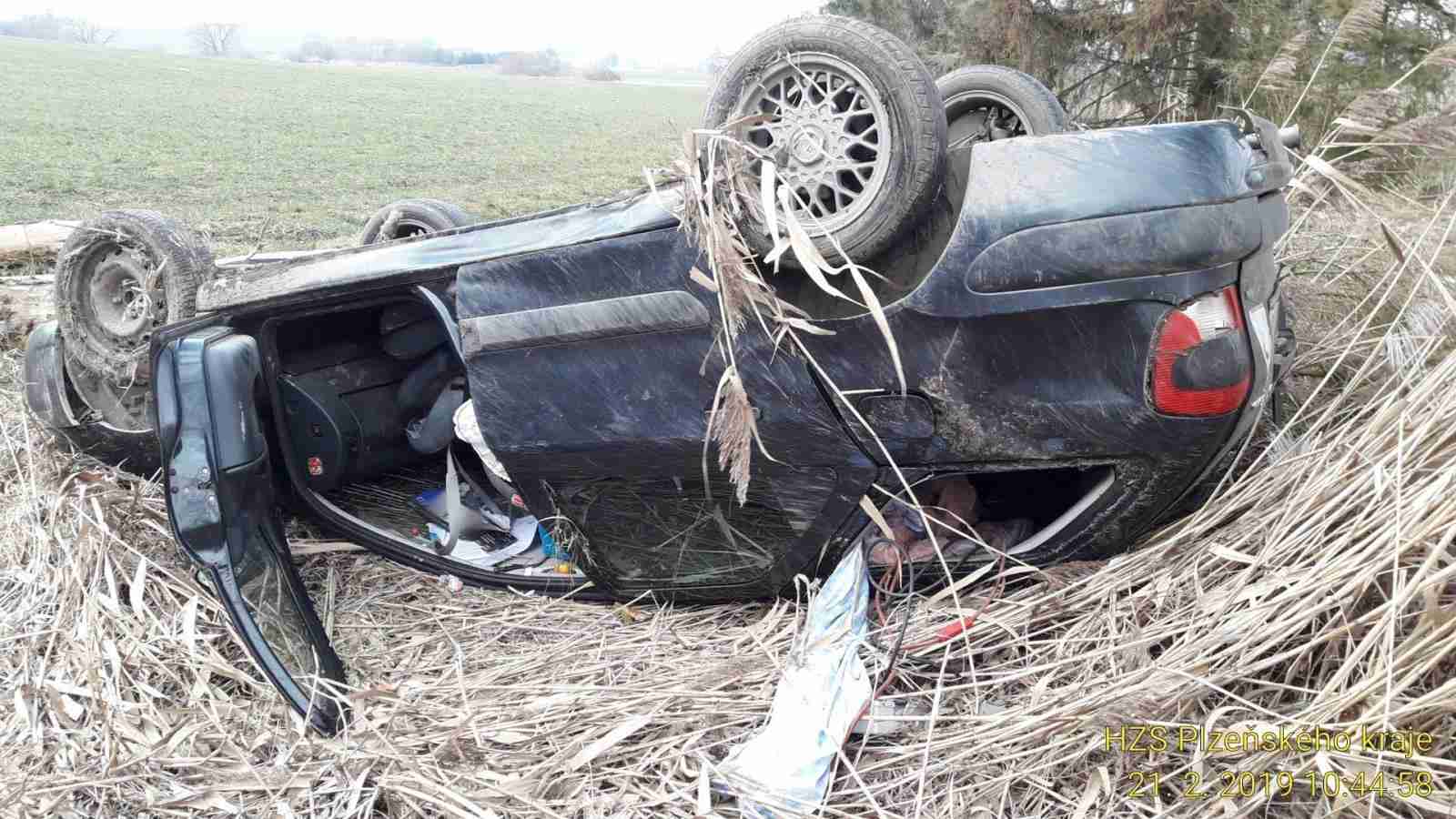 Automobil vyjel ze silnice a skončil na střeše. Uvnitř cestovala řidička a dítě. Oba byli předáni ZZS a odvezeni do Klatovské nemocnice. Zranění řidičky není vážné, dítě bylo převezeno k observaci.