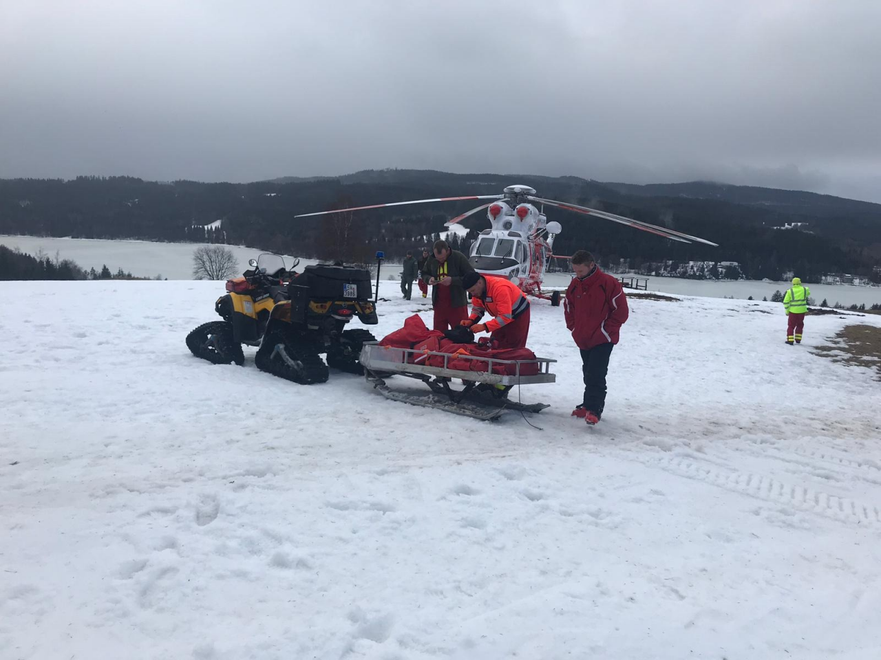 Výzva přišla na krizové číslo Horské služby 1210 od vlekaře místního skiareálu. „Podle jeho informací žena v lyžařských botách zřejmě zakopla, když se šla po jízdě občerstvit. Jak jsme poté zjistili, upadla přes židli a podle všeho si kromě dalších menších zranění mohla zlomit i pánevní kost. Vzhledem k tomu jsme se s dispečinkem linky 155 Jihočeského kraje dohodli na asistenci vrtulníku,“ popsal okolnosti nehody Aleš Fejfar, zasahující člen Horské služby Šumava. Horští záchranáři poté zraněnou lyžařku zafixovali do vakuové matrace.