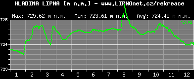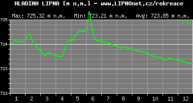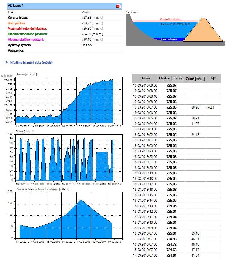 Po vydatných srážkách a tání sněhu z posledních dní došlo k výraznému nárůstu hladiny Lipenské přehrady. K maximální retenční hladině ale chybí ještě 60 cm. Hladina od února postupně stoupla o zhruba 140 cm na současnou kótu 725,07 m n.m. (stav k 19.3. 8:30). Přítok ale od neděle 17. března postupně klesá, v maximu dosáhl 170 m3/s.