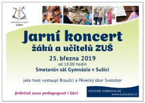 Jarním koncertem potěší posluchače a diváky žáci a učitelé ze ZUŠ Františka Stupky v Sušici v pondělí 25. března ve Smetanově sále gymnázia. Kromě
